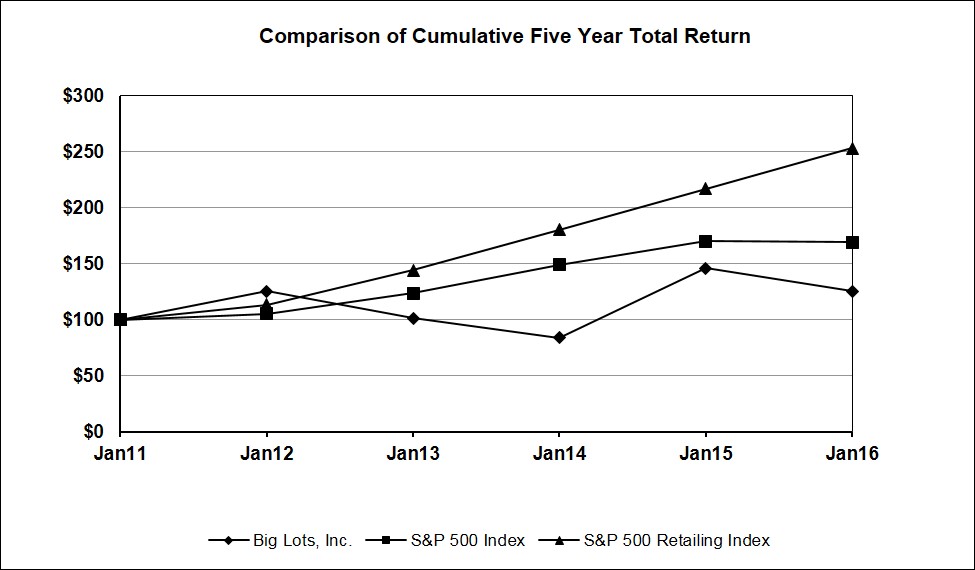 Big Lots, Inc., an Ohio corporation, through its wholly owned subsidiaries (collectively referred to herein as “we,” “us,” and “our” except as used in the reports of our independent registered public accounting firm included in Item 8 of this Annual Report on Form 10-K (“Form 10-K”)), is a unique, non-traditional, discount retailer operating in the United States of America (“U.S.”) (see the discussion below under the caption “Merchandise”). At January 30, 2016, we operated a total of 1,449 stores. Our goal is to exceed our core customer’s expectations by providing her with great savings on value-priced merchandise, which includes tasteful and “trend-right” import merchandise, consistent and replenishable “never out” offerings, and brand-name closeouts. You can locate us on the Internet at www.biglots.com. The contents of our websites are not part of this report.