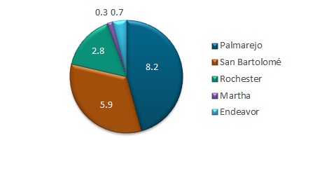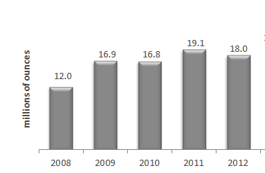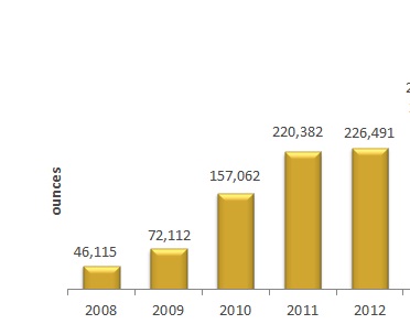 Coeur owns 100% of Coeur Mexicana S.A. de C.V. ("Coeur Mexicana"), which operates the underground and surface Palmarejo silver and gold mine in Mexico. The Palmarejo mine began shipping silver/gold doré in April 2009. Palmarejo produced 8.2 million ounces of silver and 106,038 gold ounces in 2012. On January 21, 2009, the Company entered into a gold production royalty transaction with Franco-Nevada Corporation under which Franco-Nevada purchased a royalty covering 50% of the life of mine gold to be produced by Coeur from the Palmarejo mine. Royalty payments made beyond the minimum obligation of 400,000 ounces of gold are payable when the market price per ounce of gold is greater than $400.00. The Company controls a large land position around its existing operations.