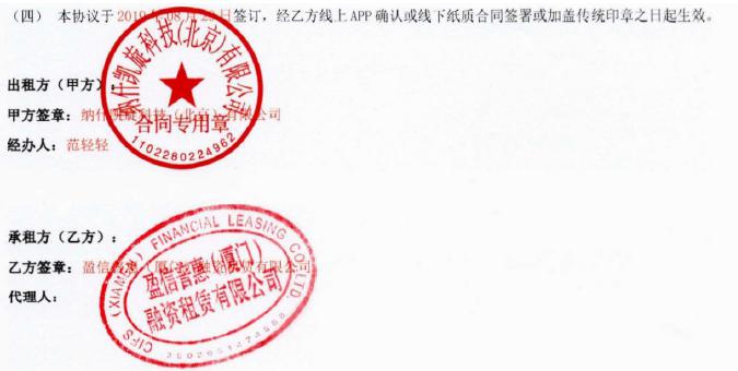 This contract will generate the electronic file with the electronic signature technology; whenever it is confirmed, such file shall have the same legal effect as the contract. The file shall be confirmed in the following two ways: 1. Online confirmation by APP; 2. Offline confirmation by signing on paper document or affixing with traditional seal.