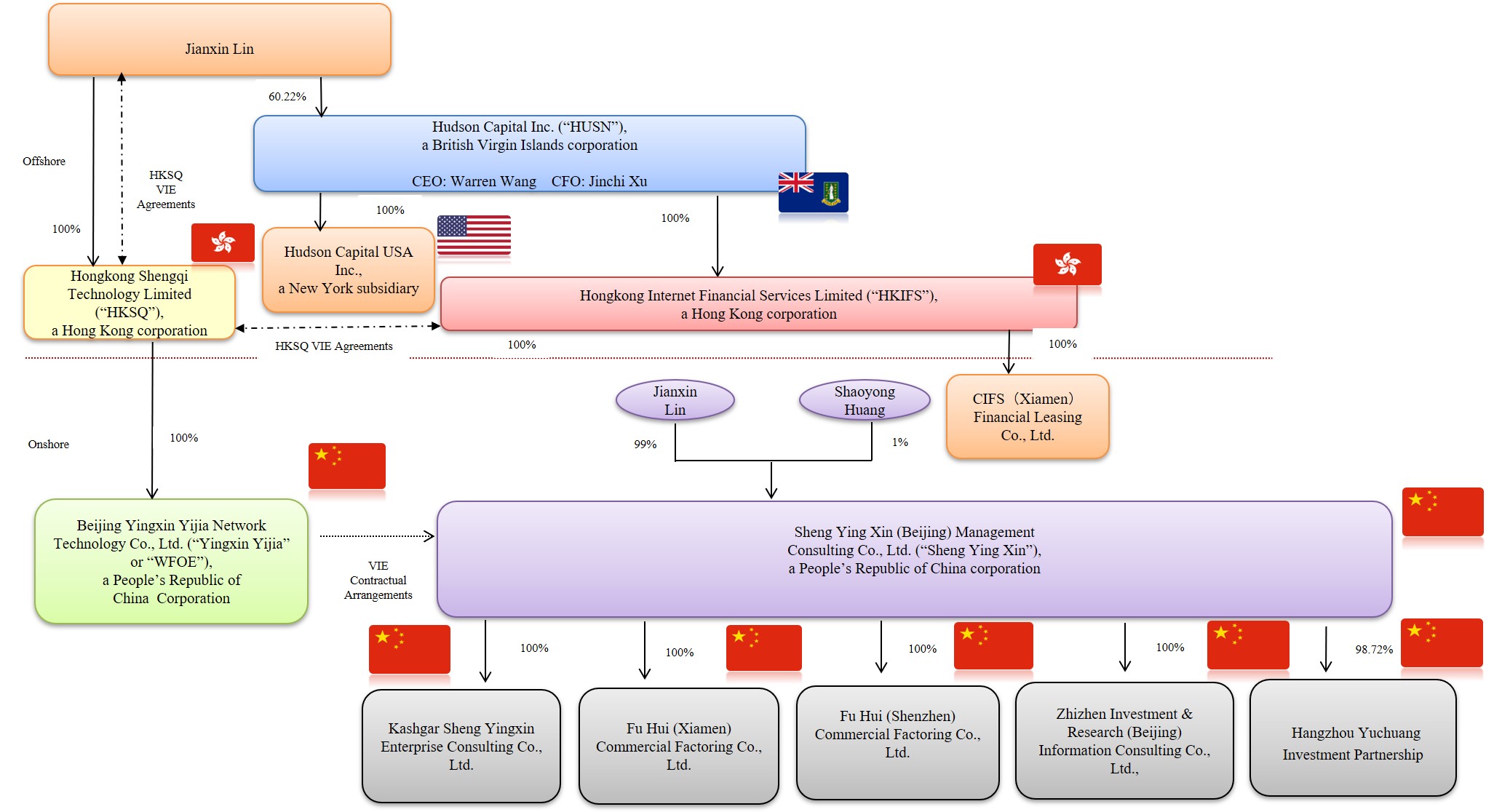 “we,” “us,” “our Company,” “our,” or “HUSN” refers to Hudson Capital Inc. (formerly known as China Internet Nationwide Financial Services, Inc.), its subsidiaries, and, in the context of describing our operations and consolidated financial information, our consolidated affiliated entities in China, including but not limited to Sheng Ying Xin (Beijing) Management Consulting Co., Ltd, Kashgar Sheng Yingxin Enterprise Consulting Co., Ltd., Fu Hui (Shenzhen) Commercial Factoring Co., Ltd., , Ltd., CIFS (Xiamen) Financial Leasing Co., Ltd., Fuhui (Xiamen) Commercial Factoring Co., Ltd., Zhizhen Investment & Research (Beijing) Information Consulting Co., Ltd., Hangzhou Yuchuang Investment Partnership and our newly-incorporated U.S. subsidiary, Hudson Capital USA Inc.