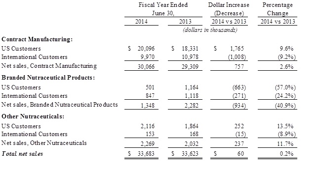 The Company has divided its operations into three reportable segments as follows: Contract Manufacturing, Branded Proprietary Products and Other Nutraceutical Businesses. The international sales, concentrated primarily in Europe and Canada, for the fiscal years ended June 30, 2014 and 2013 were $10,970 and $12,264, respectively.