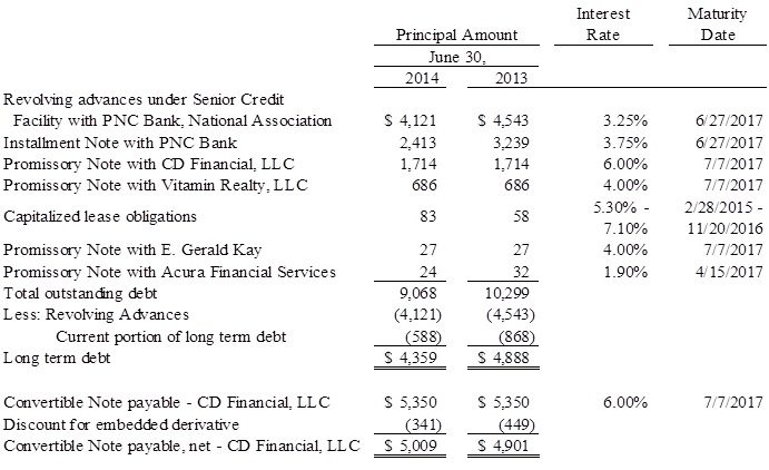 As of June 30, 2014 and 2013, the Company had the following debt outstanding: