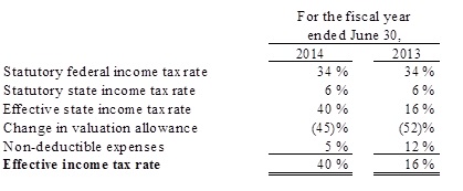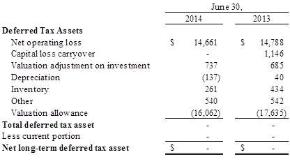 Realization of the NOL carryforwards and other deferred tax temporary differences is contingent on future taxable earnings. The Company’s deferred tax asset was reviewed for expected utilization using a “more likely than not” approach by assessing the available positive and negative evidence surrounding its recoverability. Accordingly, a valuation allowance has been recorded against the Company’s deferred tax asset, as it was determined based upon past and present taxable losses that it was “more likely than not” that the Company’s deferred tax assets would not be realized. The valuation allowance was increased to the full carrying amount of the Company’s deferred tax assets in the fiscal year ended June 30, 2009.  In future years, if the deferred tax assets are determined by management to be “more likely than not” to be realized, the recognized tax benefits relating to the reversal of the valuation allowance as of June 30, 2014 will be recorded. The Company will continue to assess and evaluate strategies that will enable the deferred tax asset, or portion thereof, to be utilized, and will reduce the valuation allowance appropriately as such time when it is determined that the “more likely than not” criteria is satisfied.