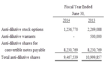 The following options, warrants and potentially dilutive shares for convertible notes payable (see Note 6. Senior Credit Facility, Subordinated Convertible Note Payable, net - CD Financial, LLC and other Long Term Debt) were not included in the computation of weighted average diluted common shares outstanding as the effect of doing so would be anti-dilutive for fiscal years ended June 30, 2014 and 2013: