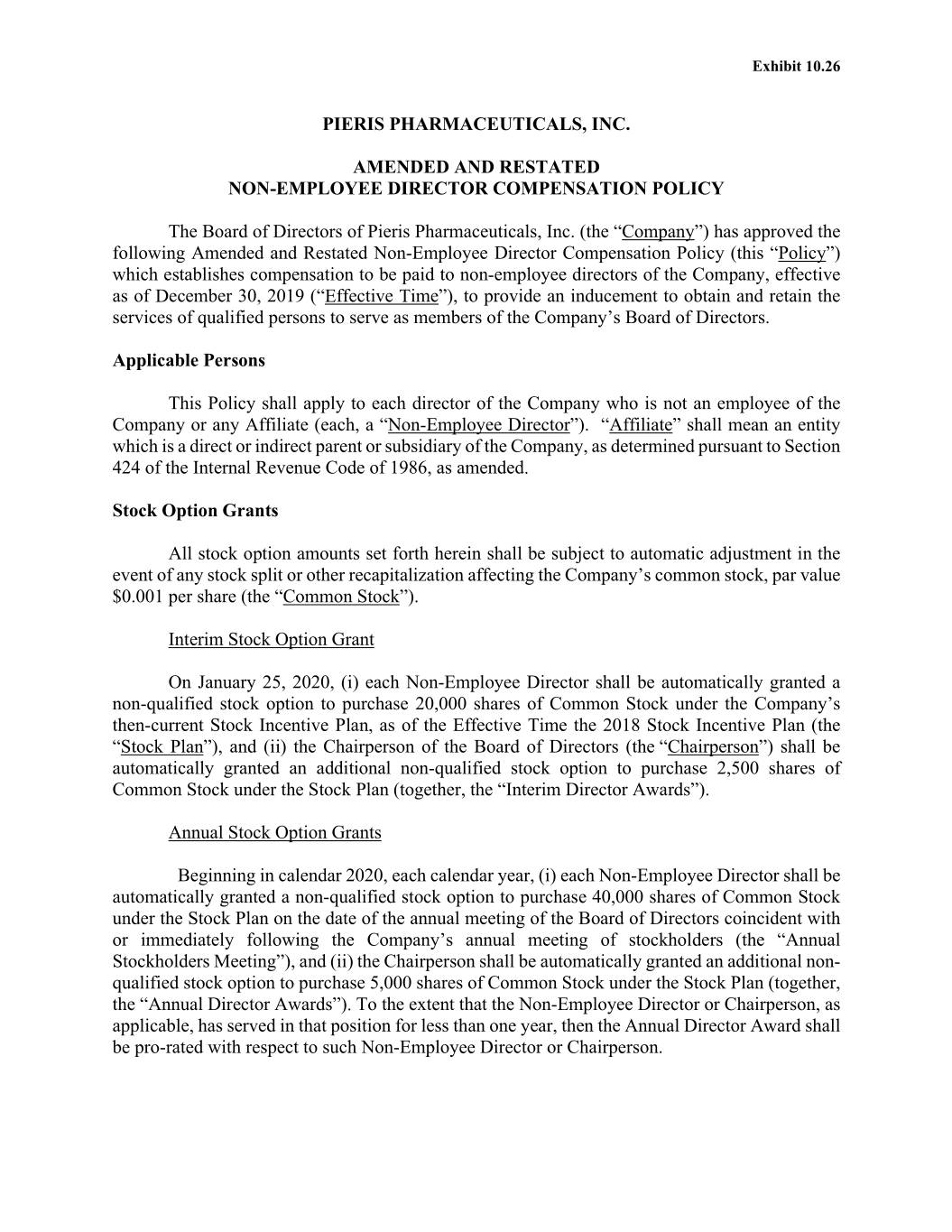 Exhibit 10.26 PIERIS PHARMACEUTICALS, INC. AMENDED AND RESTATED NON-EMPLOYEE DIRECTOR COMPENSATION POLICY The Board of Directors of Pieris Pharmaceuticals, Inc. (the “Company”) has approved the following Amended and Restated Non-Employee Director Compensation Policy (this “Policy”) which establishes compensation to be paid to non-employee directors of the Company, effective as of December 30, 2019 (“Effective Time”), to provide an inducement to obtain and retain the services of qualified persons to serve as members of the Company’s Board of Directors. Applicable Persons This Policy shall apply to each director of the Company who is not an employee of the Company or any Affiliate (each, a “Non-Employee Director”). “Affiliate” shall mean an entity which is a direct or indirect parent or subsidiary of the Company, as determined pursuant to Section 424 of the Internal Revenue Code of 1986, as amended. Stock Option Grants All stock option amounts set forth herein shall be subject to automatic adjustment in the event of any stock split or other recapitalization affecting the Company’s common stock, par value $0.001 per share (the “Common Stock”). Interim Stock Option Grant On January 25, 2020, (i) each Non-Employee Director shall be automatically granted a non-qualified stock option to purchase 20,000 shares of Common Stock under the Company’s then-current Stock Incentive Plan, as of the Effective Time the 2018 Stock Incentive Plan (the “Stock Plan”), and (ii) the Chairperson of the Board of Directors (the “Chairperson”) shall be automatically granted an additional non-qualified stock option to purchase 2,500 shares of Common Stock under the Stock Plan (together, the “Interim Director Awards”). Annual Stock Option Grants Beginning in calendar 2020, each calendar year, (i) each Non-Employee Director shall be automatically granted a non-qualified stock option to purchase 40,000 shares of Common Stock under the Stock Plan on the date of the annual meeting of the Board of Directors coincident with or immediately following the Company’s annual meeting of stockholders (the “Annual Stockholders Meeting”), and (ii) the Chairperson shall be automatically granted an additional non- qualified stock option to purchase 5,000 shares of Common Stock under the Stock Plan (together, the “Annual Director Awards”). To the extent that the Non-Employee Director or Chairperson, as applicable, has served in that position for less than one year, then the Annual Director Award shall be pro-rated with respect to such Non-Employee Director or Chairperson.