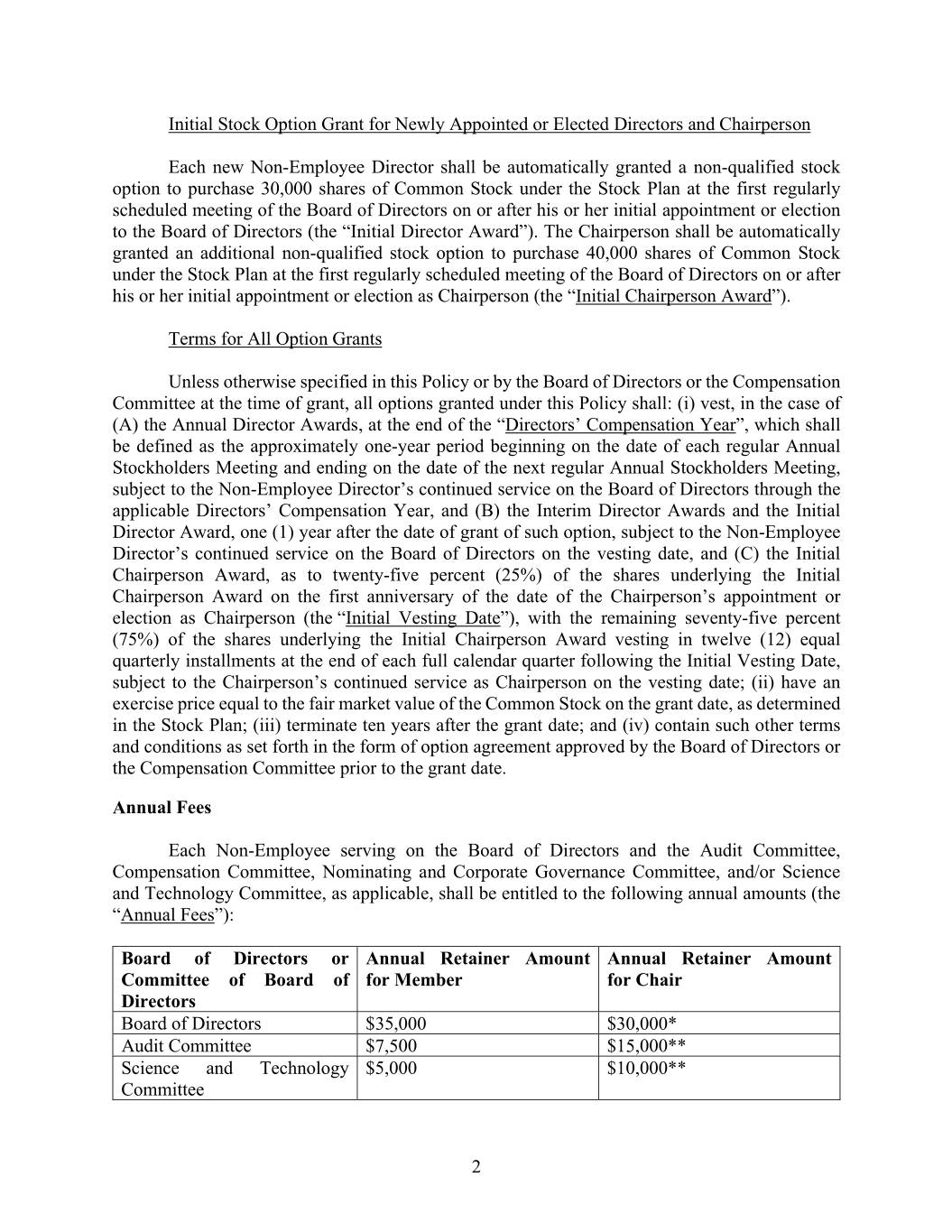 Initial Stock Option Grant for Newly Appointed or Elected Directors and Chairperson Each new Non-Employee Director shall be automatically granted a non-qualified stock option to purchase 30,000 shares of Common Stock under the Stock Plan at the first regularly scheduled meeting of the Board of Directors on or after his or her initial appointment or election to the Board of Directors (the “Initial Director Award”). The Chairperson shall be automatically granted an additional non-qualified stock option to purchase 40,000 shares of Common Stock under the Stock Plan at the first regularly scheduled meeting of the Board of Directors on or after his or her initial appointment or election as Chairperson (the “Initial Chairperson Award”). Terms for All Option Grants Unless otherwise specified in this Policy or by the Board of Directors or the Compensation Committee at the time of grant, all options granted under this Policy shall: (i) vest, in the case of (A) the Annual Director Awards, at the end of the “Directors’ Compensation Year”, which shall be defined as the approximately one-year period beginning on the date of each regular Annual Stockholders Meeting and ending on the date of the next regular Annual Stockholders Meeting, subject to the Non-Employee Director’s continued service on the Board of Directors through the applicable Directors’ Compensation Year, and (B) the Interim Director Awards and the Initial Director Award, one (1) year after the date of grant of such option, subject to the Non-Employee Director’s continued service on the Board of Directors on the vesting date, and (C) the Initial Chairperson Award, as to twenty-five percent (25%) of the shares underlying the Initial Chairperson Award on the first anniversary of the date of the Chairperson’s appointment or election as Chairperson (the “Initial Vesting Date”), with the remaining seventy-five percent (75%) of the shares underlying the Initial Chairperson Award vesting in twelve (12) equal quarterly installments at the end of each full calendar quarter following the Initial Vesting Date, subject to the Chairperson’s continued service as Chairperson on the vesting date; (ii) have an exercise price equal to the fair market value of the Common Stock on the grant date, as determined in the Stock Plan; (iii) terminate ten years after the grant date; and (iv) contain such other terms and conditions as set forth in the form of option agreement approved by the Board of Directors or the Compensation Committee prior to the grant date. Annual Fees Each Non-Employee serving on the Board of Directors and the Audit Committee, Compensation Committee, Nominating and Corporate Governance Committee, and/or Science and Technology Committee, as applicable, shall be entitled to the following annual amounts (the “Annual Fees”): Board of Directors or Annual Retainer Amount Annual Retainer Amount Committee of Board of for Member for Chair Directors Board of Directors $35,000 $30,000* Audit Committee $7,500 $15,000** Science and Technology $5,000 $10,000** Committee 2