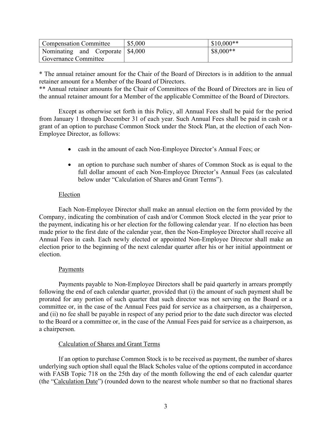 Compensation Committee $5,000 $10,000** Nominating and Corporate $4,000 $8,000** Governance Committee * The annual retainer amount for the Chair of the Board of Directors is in addition to the annual retainer amount for a Member of the Board of Directors. ** Annual retainer amounts for the Chair of Committees of the Board of Directors are in lieu of the annual retainer amount for a Member of the applicable Committee of the Board of Directors. Except as otherwise set forth in this Policy, all Annual Fees shall be paid for the period from January 1 through December 31 of each year. Such Annual Fees shall be paid in cash or a grant of an option to purchase Common Stock under the Stock Plan, at the election of each Non- Employee Director, as follows: • cash in the amount of each Non-Employee Director’s Annual Fees; or • an option to purchase such number of shares of Common Stock as is equal to the full dollar amount of each Non-Employee Director’s Annual Fees (as calculated below under “Calculation of Shares and Grant Terms”). Election Each Non-Employee Director shall make an annual election on the form provided by the Company, indicating the combination of cash and/or Common Stock elected in the year prior to the payment, indicating his or her election for the following calendar year. If no election has been made prior to the first date of the calendar year, then the Non-Employee Director shall receive all Annual Fees in cash. Each newly elected or appointed Non-Employee Director shall make an election prior to the beginning of the next calendar quarter after his or her initial appointment or election. Payments Payments payable to Non-Employee Directors shall be paid quarterly in arrears promptly following the end of each calendar quarter, provided that (i) the amount of such payment shall be prorated for any portion of such quarter that such director was not serving on the Board or a committee or, in the case of the Annual Fees paid for service as a chairperson, as a chairperson, and (ii) no fee shall be payable in respect of any period prior to the date such director was elected to the Board or a committee or, in the case of the Annual Fees paid for service as a chairperson, as a chairperson. Calculation of Shares and Grant Terms If an option to purchase Common Stock is to be received as payment, the number of shares underlying such option shall equal the Black Scholes value of the options computed in accordance with FASB Topic 718 on the 25th day of the month following the end of each calendar quarter (the “Calculation Date”) (rounded down to the nearest whole number so that no fractional shares 3