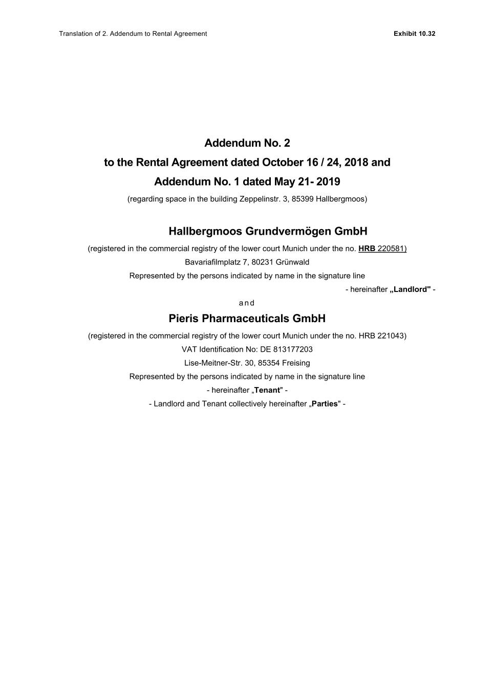 Translation of 2. Addendum to Rental Agreement Exhibit 10.32 Addendum No. 2 to the Rental Agreement dated October 16 / 24, 2018 and Addendum No. 1 dated May 21- 2019 (regarding space in the building Zeppelinstr. 3, 85399 Hallbergmoos) Hallbergmoos Grundvermögen GmbH (registered in the commercial registry of the lower court Munich under the no. HRB 220581) Bavariafilmplatz 7, 80231 Grünwald Represented by the persons indicated by name in the signature line - hereinafter „Landlord" - a nd Pieris Pharmaceuticals GmbH (registered in the commercial registry of the lower court Munich under the no. HRB 221043) VAT Identification No: DE 813177203 Lise-Meitner-Str. 30, 85354 Freising Represented by the persons indicated by name in the signature line - hereinafter „Tenant" - - Landlord and Tenant collectively hereinafter „Parties" -