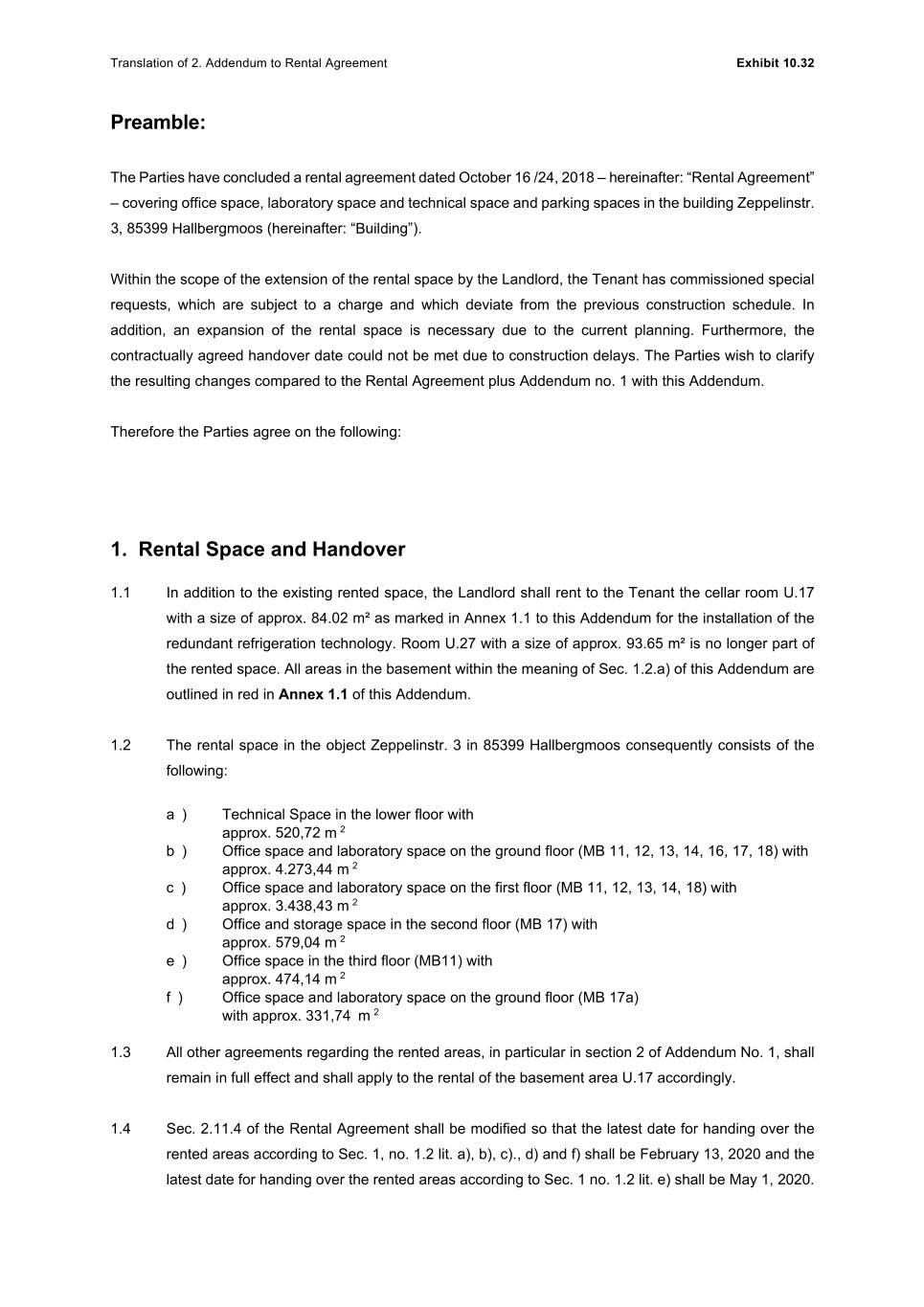 Translation of 2. Addendum to Rental Agreement Exhibit 10.32 Preamble: The Parties have concluded a rental agreement dated October 16 /24, 2018 – hereinafter: “Rental Agreement” – covering office space, laboratory space and technical space and parking spaces in the building Zeppelinstr. 3, 85399 Hallbergmoos (hereinafter: “Building”). Within the scope of the extension of the rental space by the Landlord, the Tenant has commissioned special requests, which are subject to a charge and which deviate from the previous construction schedule. In addition, an expansion of the rental space is necessary due to the current planning. Furthermore, the contractually agreed handover date could not be met due to construction delays. The Parties wish to clarify the resulting changes compared to the Rental Agreement plus Addendum no. 1 with this Addendum. Therefore the Parties agree on the following: 1. Rental Space and Handover 1.1 In addition to the existing rented space, the Landlord shall rent to the Tenant the cellar room U.17 with a size of approx. 84.02 m² as marked in Annex 1.1 to this Addendum for the installation of the redundant refrigeration technology. Room U.27 with a size of approx. 93.65 m² is no longer part of the rented space. All areas in the basement within the meaning of Sec. 1.2.a) of this Addendum are outlined in red in Annex 1.1 of this Addendum. 1.2 The rental space in the object Zeppelinstr. 3 in 85399 Hallbergmoos consequently consists of the following: a) Technical Space in the lower floor with approx. 520,72 m 2 b) Office space and laboratory space on the ground floor (MB 11, 12, 13, 14, 16, 17, 18) with approx. 4.273,44 m 2 c) Office space and laboratory space on the first floor (MB 11, 12, 13, 14, 18) with approx. 3.438,43 m 2 d) Office and storage space in the second floor (MB 17) with approx. 579,04 m 2 e) Office space in the third floor (MB11) with approx. 474,14 m 2 f) Office space and laboratory space on the ground floor (MB 17a) with approx. 331,74 m 2 1.3 All other agreements regarding the rented areas, in particular in section 2 of Addendum No. 1, shall remain in full effect and shall apply to the rental of the basement area U.17 accordingly. 1.4 Sec. 2.11.4 of the Rental Agreement shall be modified so that the latest date for handing over the rented areas according to Sec. 1, no. 1.2 lit. a), b), c)., d) and f) shall be February 13, 2020 and the latest date for handing over the rented areas according to Sec. 1 no. 1.2 lit. e) shall be May 1, 2020.