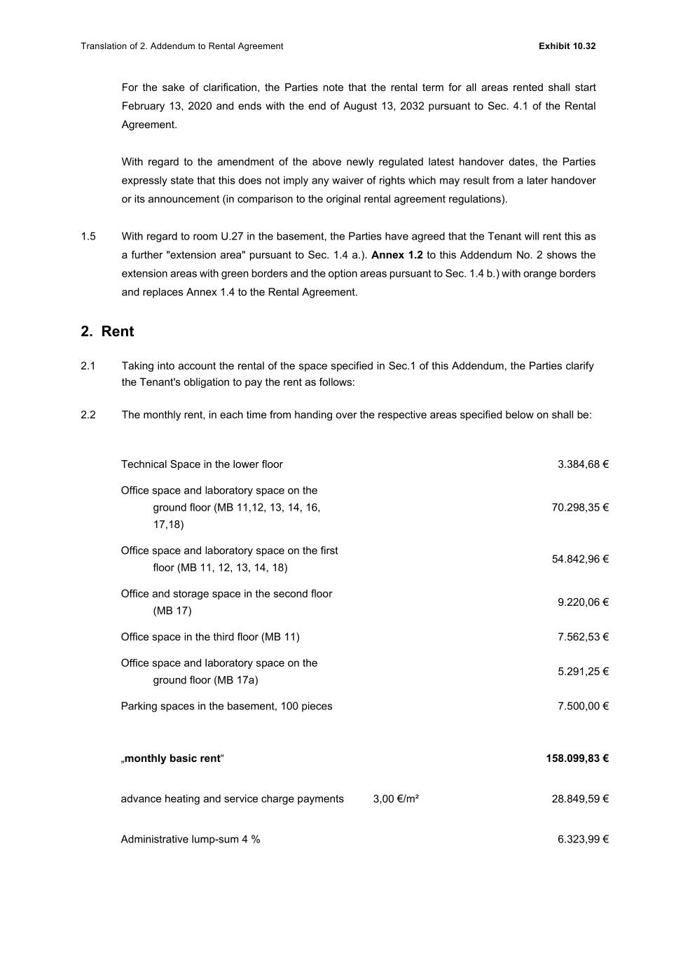 Translation of 2. Addendum to Rental Agreement Exhibit 10.32 For the sake of clarification, the Parties note that the rental term for all areas rented shall start February 13, 2020 and ends with the end of August 13, 2032 pursuant to Sec. 4.1 of the Rental Agreement. With regard to the amendment of the above newly regulated latest handover dates, the Parties expressly state that this does not imply any waiver of rights which may result from a later handover or its announcement (in comparison to the original rental agreement regulations). 1.5 With regard to room U.27 in the basement, the Parties have agreed that the Tenant will rent this as a further "extension area" pursuant to Sec. 1.4 a.). Annex 1.2 to this Addendum No. 2 shows the extension areas with green borders and the option areas pursuant to Sec. 1.4 b.) with orange borders and replaces Annex 1.4 to the Rental Agreement. 2. Rent 2.1 Taking into account the rental of the space specified in Sec.1 of this Addendum, the Parties clarify the Tenant's obligation to pay the rent as follows: 2.2 The monthly rent, in each time from handing over the respective areas specified below on shall be: Technical Space in the lower floor 3.384,68 € Office space and laboratory space on the ground floor (MB 11,12, 13, 14, 16, 70.298,35 € 17,18) Office space and laboratory space on the first 54.842,96 € floor (MB 11, 12, 13, 14, 18) Office and storage space in the second floor 9.220,06 € (MB 17) Office space in the third floor (MB 11) 7.562,53 € Office space and laboratory space on the 5.291,25 € ground floor (MB 17a) Parking spaces in the basement, 100 pieces 7.500,00 € „monthly basic rent“ 158.099,83 € advance heating and service charge payments 3,00 €/m² 28.849,59 € Administrative lump-sum 4 % 6.323,99 €