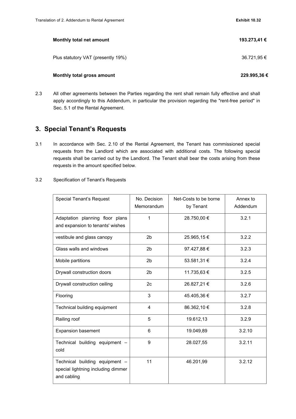 Translation of 2. Addendum to Rental Agreement Exhibit 10.32 Monthly total net amount 193.273,41 € Plus statutory VAT (presently 19%) 36.721,95 € Monthly total gross amount 229.995,36 € 2.3 All other agreements between the Parties regarding the rent shall remain fully effective and shall apply accordingly to this Addendum, in particular the provision regarding the "rent-free period" in Sec. 5.1 of the Rental Agreement. 3. Special Tenant’s Requests 3.1 In accordance with Sec. 2.10 of the Rental Agreement, the Tenant has commissioned special requests from the Landlord which are associated with additional costs. The following special requests shall be carried out by the Landlord. The Tenant shall bear the costs arising from these requests in the amount specified below. 3.2 Specification of Tenant’s Requests Special Tenant’s Request No. Decision Net-Costs to be borne Annex to Memorandum by Tenant Addendum Adaptation planning floor plans 1 28.750,00 € 3.2.1 and expansion to tenants' wishes vestibule and glass canopy 2b 25.965,15 € 3.2.2 Glass walls and windows 2b 97.427,88 € 3.2.3 Mobile partitions 2b 53.581,31 € 3.2.4 Drywall construction doors 2b 11.735,63 € 3.2.5 Drywall construction ceiling 2c 26.827,21 € 3.2.6 Flooring 3 45.405,36 € 3.2.7 Technical building equipment 4 86.362,10 € 3.2.8 Railing roof 5 19.612,13 3.2.9 Expansion basement 6 19.049,89 3.2.10 Technical building equipment – 9 28.027,55 3.2.11 cold Technical building equipment – 11 46.201,99 3.2.12 special lightning including dimmer and cabling