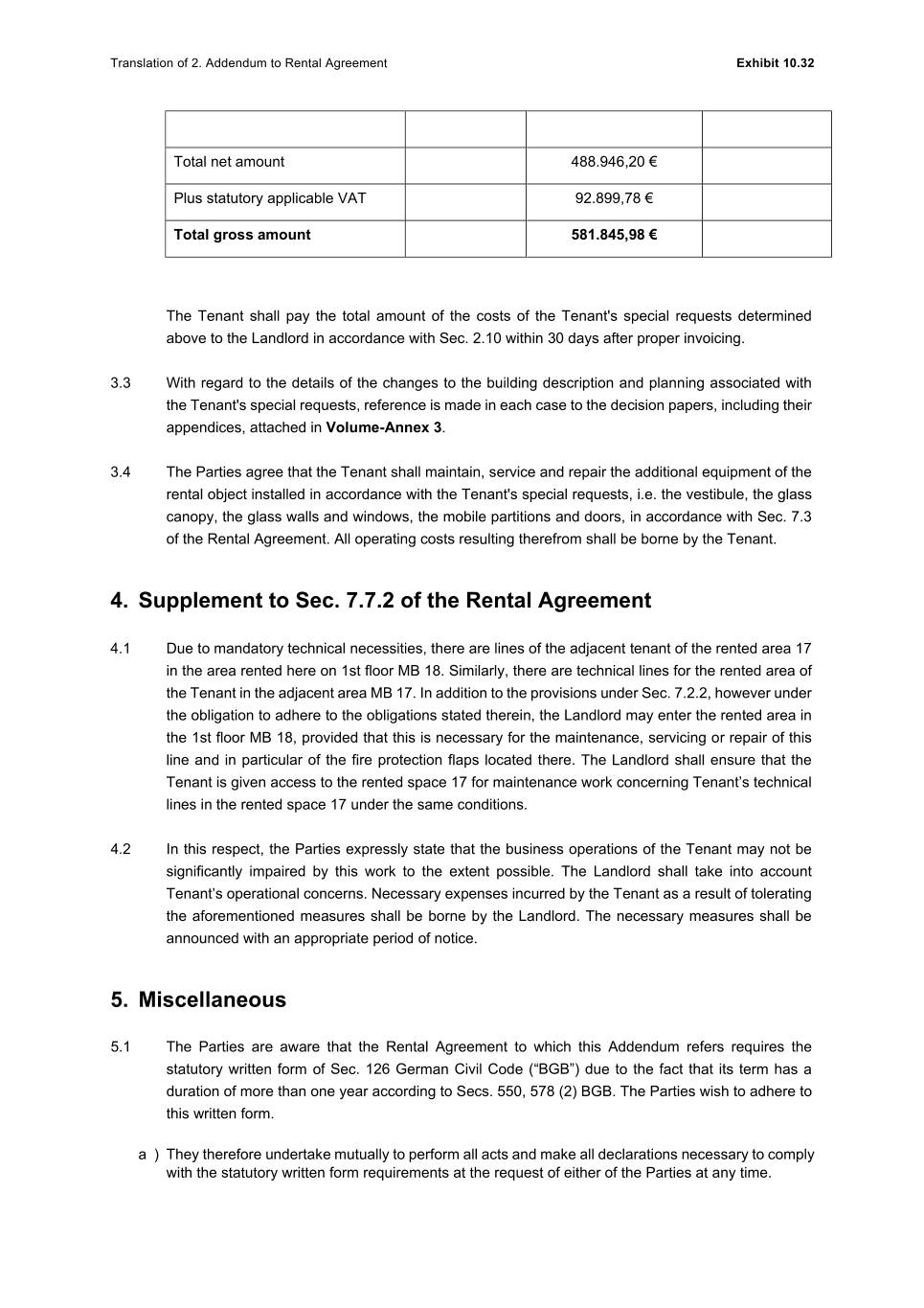 Translation of 2. Addendum to Rental Agreement Exhibit 10.32 Total net amount 488.946,20 € Plus statutory applicable VAT 92.899,78 € Total gross amount 581.845,98 € The Tenant shall pay the total amount of the costs of the Tenant's special requests determined above to the Landlord in accordance with Sec. 2.10 within 30 days after proper invoicing. 3.3 With regard to the details of the changes to the building description and planning associated with the Tenant's special requests, reference is made in each case to the decision papers, including their appendices, attached in Volume-Annex 3. 3.4 The Parties agree that the Tenant shall maintain, service and repair the additional equipment of the rental object installed in accordance with the Tenant's special requests, i.e. the vestibule, the glass canopy, the glass walls and windows, the mobile partitions and doors, in accordance with Sec. 7.3 of the Rental Agreement. All operating costs resulting therefrom shall be borne by the Tenant. 4. Supplement to Sec. 7.7.2 of the Rental Agreement 4.1 Due to mandatory technical necessities, there are lines of the adjacent tenant of the rented area 17 in the area rented here on 1st floor MB 18. Similarly, there are technical lines for the rented area of the Tenant in the adjacent area MB 17. In addition to the provisions under Sec. 7.2.2, however under the obligation to adhere to the obligations stated therein, the Landlord may enter the rented area in the 1st floor MB 18, provided that this is necessary for the maintenance, servicing or repair of this line and in particular of the fire protection flaps located there. The Landlord shall ensure that the Tenant is given access to the rented space 17 for maintenance work concerning Tenant’s technical lines in the rented space 17 under the same conditions. 4.2 In this respect, the Parties expressly state that the business operations of the Tenant may not be significantly impaired by this work to the extent possible. The Landlord shall take into account Tenant’s operational concerns. Necessary expenses incurred by the Tenant as a result of tolerating the aforementioned measures shall be borne by the Landlord. The necessary measures shall be announced with an appropriate period of notice. 5. Miscellaneous 5.1 The Parties are aware that the Rental Agreement to which this Addendum refers requires the statutory written form of Sec. 126 German Civil Code (“BGB”) due to the fact that its term has a duration of more than one year according to Secs. 550, 578 (2) BGB. The Parties wish to adhere to this written form. a) They therefore undertake mutually to perform all acts and make all declarations necessary to comply with the statutory written form requirements at the request of either of the Parties at any time.