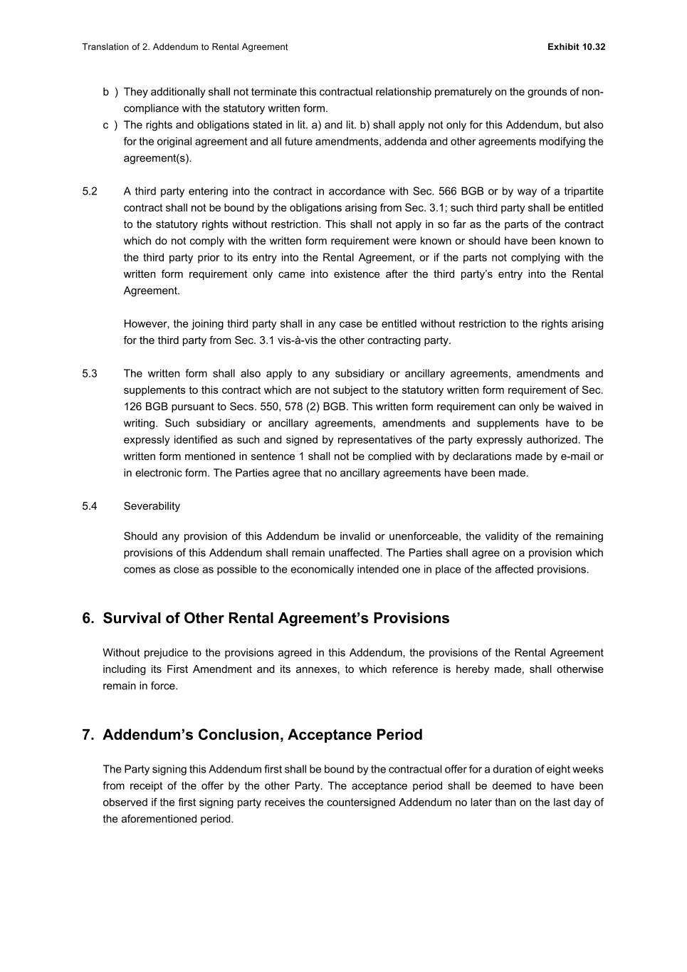 Translation of 2. Addendum to Rental Agreement Exhibit 10.32 b) They additionally shall not terminate this contractual relationship prematurely on the grounds of non- compliance with the statutory written form. c) The rights and obligations stated in lit. a) and lit. b) shall apply not only for this Addendum, but also for the original agreement and all future amendments, addenda and other agreements modifying the agreement(s). 5.2 A third party entering into the contract in accordance with Sec. 566 BGB or by way of a tripartite contract shall not be bound by the obligations arising from Sec. 3.1; such third party shall be entitled to the statutory rights without restriction. This shall not apply in so far as the parts of the contract which do not comply with the written form requirement were known or should have been known to the third party prior to its entry into the Rental Agreement, or if the parts not complying with the written form requirement only came into existence after the third party’s entry into the Rental Agreement. However, the joining third party shall in any case be entitled without restriction to the rights arising for the third party from Sec. 3.1 vis-à-vis the other contracting party. 5.3 The written form shall also apply to any subsidiary or ancillary agreements, amendments and supplements to this contract which are not subject to the statutory written form requirement of Sec. 126 BGB pursuant to Secs. 550, 578 (2) BGB. This written form requirement can only be waived in writing. Such subsidiary or ancillary agreements, amendments and supplements have to be expressly identified as such and signed by representatives of the party expressly authorized. The written form mentioned in sentence 1 shall not be complied with by declarations made by e-mail or in electronic form. The Parties agree that no ancillary agreements have been made. 5.4 Severability Should any provision of this Addendum be invalid or unenforceable, the validity of the remaining provisions of this Addendum shall remain unaffected. The Parties shall agree on a provision which comes as close as possible to the economically intended one in place of the affected provisions. 6. Survival of Other Rental Agreement’s Provisions Without prejudice to the provisions agreed in this Addendum, the provisions of the Rental Agreement including its First Amendment and its annexes, to which reference is hereby made, shall otherwise remain in force. 7. Addendum’s Conclusion, Acceptance Period The Party signing this Addendum first shall be bound by the contractual offer for a duration of eight weeks from receipt of the offer by the other Party. The acceptance period shall be deemed to have been observed if the first signing party receives the countersigned Addendum no later than on the last day of the aforementioned period.