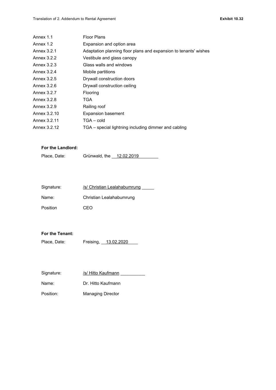 Translation of 2. Addendum to Rental Agreement Exhibit 10.32 Annex 1.1 Floor Plans Annex 1.2 Expansion and option area Annex 3.2.1 Adaptation planning floor plans and expansion to tenants' wishes Annex 3.2.2 Vestibule and glass canopy Annex 3.2.3 Glass walls and windows Annex 3.2.4 Mobile partitions Annex 3.2.5 Drywall construction doors Annex 3.2.6 Drywall construction ceiling Annex 3.2.7 Flooring Annex 3.2.8 TGA Annex 3.2.9 Railing roof Annex 3.2.10 Expansion basement Annex 3.2.11 TGA – cold Annex 3.2.12 TGA – special lightning including dimmer and cabling For the Landlord: Place, Date: Grünwald, the __12.02.2019________ Signature: /s/ Christian Lealahabumrung _____ Name: Christian Lealahabumrung Position CEO For the Tenant: Place, Date: Freising, __13.02.2020____ Signature: /s/ Hitto Kaufmann __________ Name: Dr. Hitto Kaufmann Position: Managing Director
