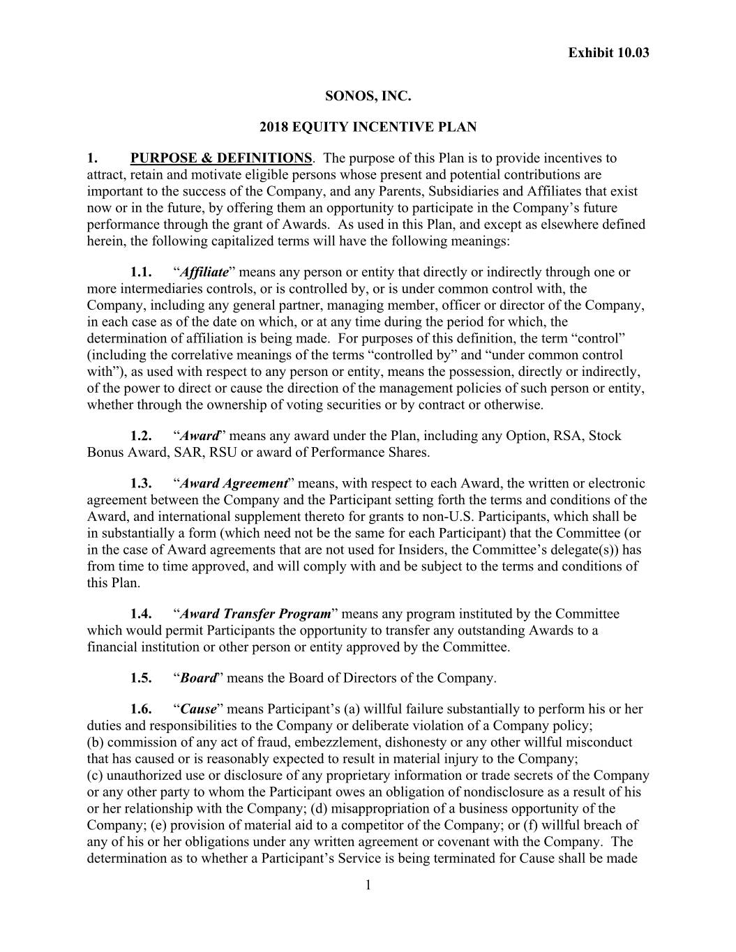 Exhibit 10.03 SONOS, INC. 2018 EQUITY INCENTIVE PLAN 1. PURPOSE & DEFINITIONS. The purpose of this Plan is to provide incentives to attract, retain and motivate eligible persons whose present and potential contributions are important to the success of the Company, and any Parents, Subsidiaries and Affiliates that exist now or in the future, by offering them an opportunity to participate in the Company’s future performance through the grant of Awards. As used in this Plan, and except as elsewhere defined herein, the following capitalized terms will have the following meanings: 1.1. “Affiliate” means any person or entity that directly or indirectly through one or more intermediaries controls, or is controlled by, or is under common control with, the Company, including any general partner, managing member, officer or director of the Company, in each case as of the date on which, or at any time during the period for which, the determination of affiliation is being made. For purposes of this definition, the term “control” (including the correlative meanings of the terms “controlled by” and “under common control with”), as used with respect to any person or entity, means the possession, directly or indirectly, of the power to direct or cause the direction of the management policies of such person or entity, whether through the ownership of voting securities or by contract or otherwise. 1.2. “Award” means any award under the Plan, including any Option, RSA, Stock Bonus Award, SAR, RSU or award of Performance Shares. 1.3. “Award Agreement” means, with respect to each Award, the written or electronic agreement between the Company and the Participant setting forth the terms and conditions of the Award, and international supplement thereto for grants to non-U.S. Participants, which shall be in substantially a form (which need not be the same for each Participant) that the Committee (or in the case of Award agreements that are not used for Insiders, the Committee’s delegate(s)) has from time to time approved, and will comply with and be subject to the terms and conditions of this Plan. 1.4. “Award Transfer Program” means any program instituted by the Committee which would permit Participants the opportunity to transfer any outstanding Awards to a financial institution or other person or entity approved by the Committee. 1.5. “Board” means the Board of Directors of the Company. 1.6. “Cause” means Participant’s (a) willful failure substantially to perform his or her duties and responsibilities to the Company or deliberate violation of a Company policy; (b) commission of any act of fraud, embezzlement, dishonesty or any other willful misconduct that has caused or is reasonably expected to result in material injury to the Company; (c) unauthorized use or disclosure of any proprietary information or trade secrets of the Company or any other party to whom the Participant owes an obligation of nondisclosure as a result of his or her relationship with the Company; (d) misappropriation of a business opportunity of the Company; (e) provision of material aid to a competitor of the Company; or (f) willful breach of any of his or her obligations under any written agreement or covenant with the Company. The determination as to whether a Participant’s Service is being terminated for Cause shall be made 1