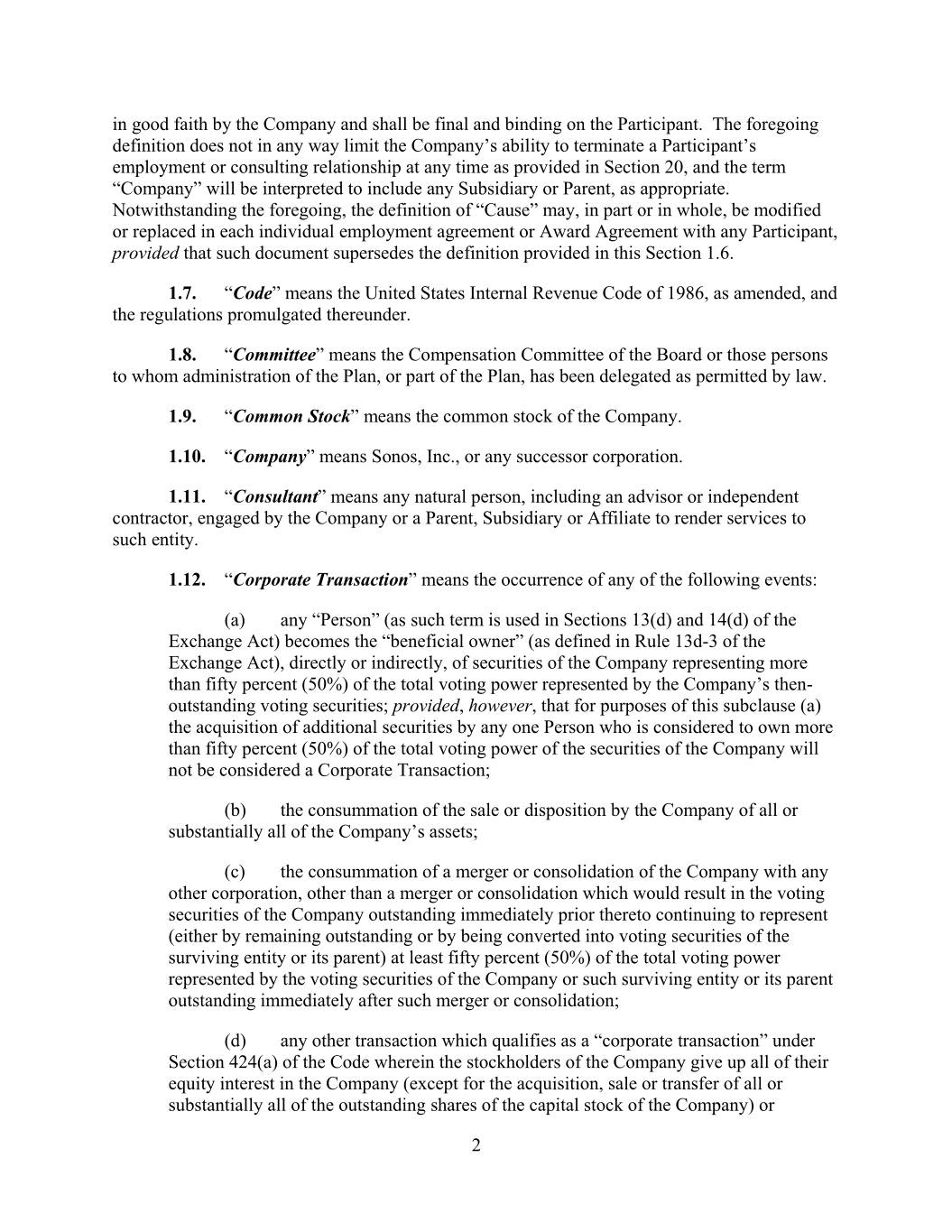 in good faith by the Company and shall be final and binding on the Participant. The foregoing definition does not in any way limit the Company’s ability to terminate a Participant’s employment or consulting relationship at any time as provided in Section 20, and the term “Company” will be interpreted to include any Subsidiary or Parent, as appropriate. Notwithstanding the foregoing, the definition of “Cause” may, in part or in whole, be modified or replaced in each individual employment agreement or Award Agreement with any Participant, provided that such document supersedes the definition provided in this Section 1.6. 1.7. “Code” means the United States Internal Revenue Code of 1986, as amended, and the regulations promulgated thereunder. 1.8. “Committee” means the Compensation Committee of the Board or those persons to whom administration of the Plan, or part of the Plan, has been delegated as permitted by law. 1.9. “Common Stock” means the common stock of the Company. 1.10. “Company” means Sonos, Inc., or any successor corporation. 1.11. “Consultant” means any natural person, including an advisor or independent contractor, engaged by the Company or a Parent, Subsidiary or Affiliate to render services to such entity. 1.12. “Corporate Transaction” means the occurrence of any of the following events: (a) any “Person” (as such term is used in Sections 13(d) and 14(d) of the Exchange Act) becomes the “beneficial owner” (as defined in Rule 13d-3 of the Exchange Act), directly or indirectly, of securities of the Company representing more than fifty percent (50%) of the total voting power represented by the Company’s then- outstanding voting securities; provided, however, that for purposes of this subclause (a) the acquisition of additional securities by any one Person who is considered to own more than fifty percent (50%) of the total voting power of the securities of the Company will not be considered a Corporate Transaction; (b) the consummation of the sale or disposition by the Company of all or substantially all of the Company’s assets; (c) the consummation of a merger or consolidation of the Company with any other corporation, other than a merger or consolidation which would result in the voting securities of the Company outstanding immediately prior thereto continuing to represent (either by remaining outstanding or by being converted into voting securities of the surviving entity or its parent) at least fifty percent (50%) of the total voting power represented by the voting securities of the Company or such surviving entity or its parent outstanding immediately after such merger or consolidation; (d) any other transaction which qualifies as a “corporate transaction” under Section 424(a) of the Code wherein the stockholders of the Company give up all of their equity interest in the Company (except for the acquisition, sale or transfer of all or substantially all of the outstanding shares of the capital stock of the Company) or 2