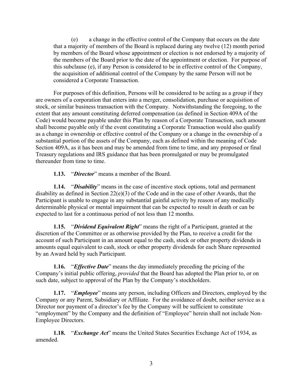(e) a change in the effective control of the Company that occurs on the date that a majority of members of the Board is replaced during any twelve (12) month period by members of the Board whose appointment or election is not endorsed by a majority of the members of the Board prior to the date of the appointment or election. For purpose of this subclause (e), if any Person is considered to be in effective control of the Company, the acquisition of additional control of the Company by the same Person will not be considered a Corporate Transaction. For purposes of this definition, Persons will be considered to be acting as a group if they are owners of a corporation that enters into a merger, consolidation, purchase or acquisition of stock, or similar business transaction with the Company. Notwithstanding the foregoing, to the extent that any amount constituting deferred compensation (as defined in Section 409A of the Code) would become payable under this Plan by reason of a Corporate Transaction, such amount shall become payable only if the event constituting a Corporate Transaction would also qualify as a change in ownership or effective control of the Company or a change in the ownership of a substantial portion of the assets of the Company, each as defined within the meaning of Code Section 409A, as it has been and may be amended from time to time, and any proposed or final Treasury regulations and IRS guidance that has been promulgated or may be promulgated thereunder from time to time. 1.13. “Director” means a member of the Board. 1.14. “Disability” means in the case of incentive stock options, total and permanent disability as defined in Section 22(e)(3) of the Code and in the case of other Awards, that the Participant is unable to engage in any substantial gainful activity by reason of any medically determinable physical or mental impairment that can be expected to result in death or can be expected to last for a continuous period of not less than 12 months. 1.15. “Dividend Equivalent Right” means the right of a Participant, granted at the discretion of the Committee or as otherwise provided by the Plan, to receive a credit for the account of such Participant in an amount equal to the cash, stock or other property dividends in amounts equal equivalent to cash, stock or other property dividends for each Share represented by an Award held by such Participant. 1.16. “Effective Date” means the day immediately preceding the pricing of the Company’s initial public offering, provided that the Board has adopted the Plan prior to, or on such date, subject to approval of the Plan by the Company’s stockholders. 1.17. “Employee” means any person, including Officers and Directors, employed by the Company or any Parent, Subsidiary or Affiliate. For the avoidance of doubt, neither service as a Director nor payment of a director’s fee by the Company will be sufficient to constitute “employment” by the Company and the definition of “Employee” herein shall not include Non- Employee Directors. 1.18. “Exchange Act” means the United States Securities Exchange Act of 1934, as amended. 3