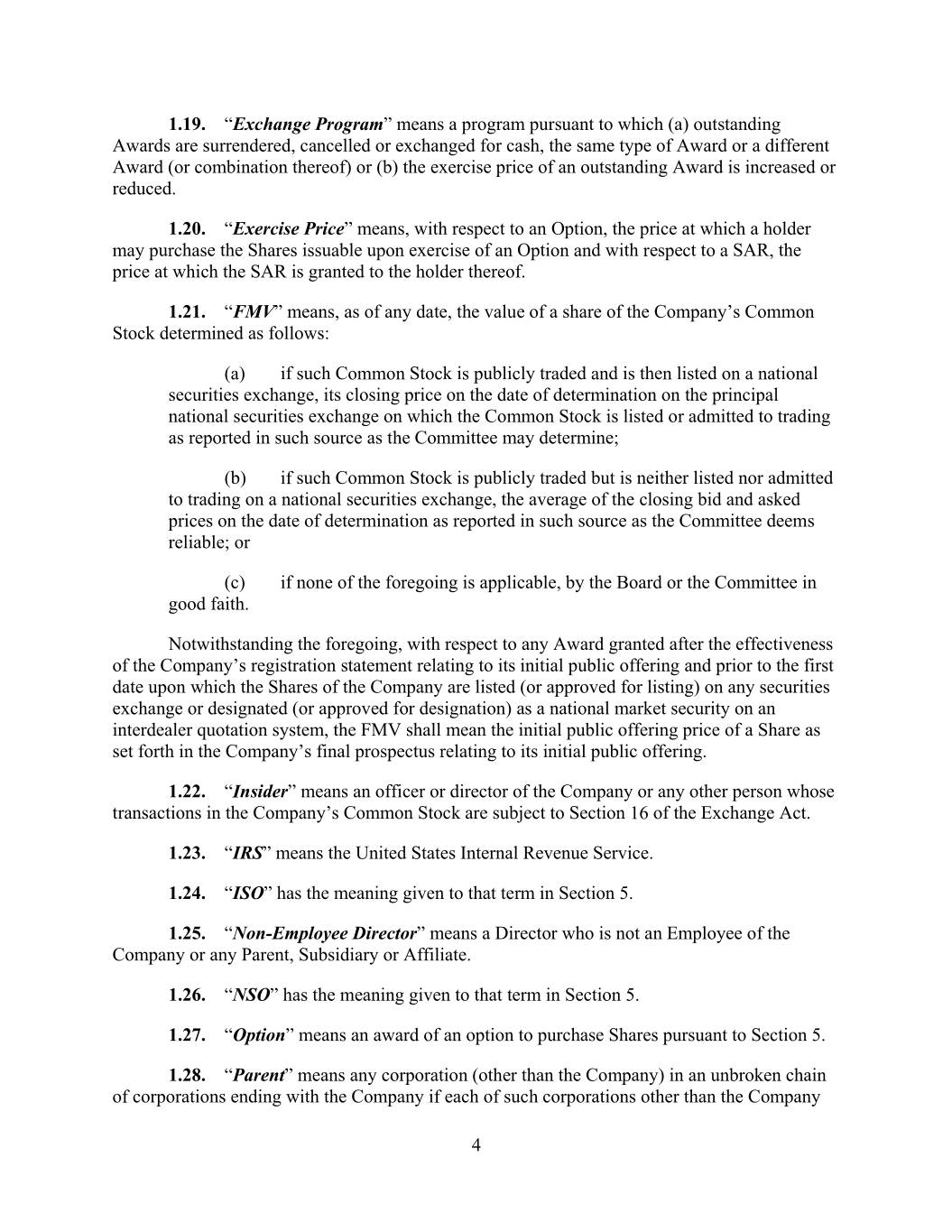1.19. “Exchange Program” means a program pursuant to which (a) outstanding Awards are surrendered, cancelled or exchanged for cash, the same type of Award or a different Award (or combination thereof) or (b) the exercise price of an outstanding Award is increased or reduced. 1.20. “Exercise Price” means, with respect to an Option, the price at which a holder may purchase the Shares issuable upon exercise of an Option and with respect to a SAR, the price at which the SAR is granted to the holder thereof. 1.21. “FMV” means, as of any date, the value of a share of the Company’s Common Stock determined as follows: (a) if such Common Stock is publicly traded and is then listed on a national securities exchange, its closing price on the date of determination on the principal national securities exchange on which the Common Stock is listed or admitted to trading as reported in such source as the Committee may determine; (b) if such Common Stock is publicly traded but is neither listed nor admitted to trading on a national securities exchange, the average of the closing bid and asked prices on the date of determination as reported in such source as the Committee deems reliable; or (c) if none of the foregoing is applicable, by the Board or the Committee in good faith. Notwithstanding the foregoing, with respect to any Award granted after the effectiveness of the Company’s registration statement relating to its initial public offering and prior to the first date upon which the Shares of the Company are listed (or approved for listing) on any securities exchange or designated (or approved for designation) as a national market security on an interdealer quotation system, the FMV shall mean the initial public offering price of a Share as set forth in the Company’s final prospectus relating to its initial public offering. 1.22. “Insider” means an officer or director of the Company or any other person whose transactions in the Company’s Common Stock are subject to Section 16 of the Exchange Act. 1.23. “IRS” means the United States Internal Revenue Service. 1.24. “ISO” has the meaning given to that term in Section 5. 1.25. “Non-Employee Director” means a Director who is not an Employee of the Company or any Parent, Subsidiary or Affiliate. 1.26. “NSO” has the meaning given to that term in Section 5. 1.27. “Option” means an award of an option to purchase Shares pursuant to Section 5. 1.28. “Parent” means any corporation (other than the Company) in an unbroken chain of corporations ending with the Company if each of such corporations other than the Company 4