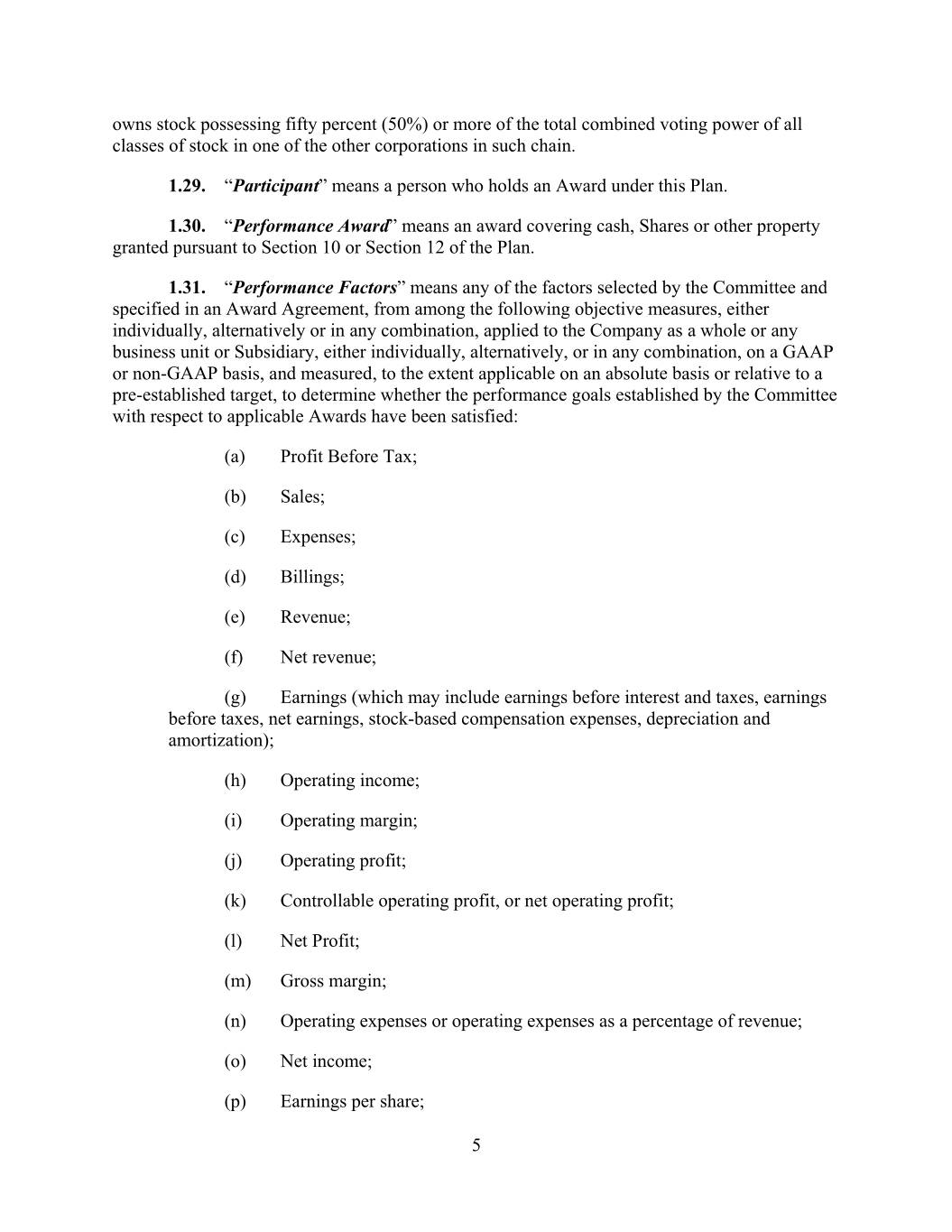 owns stock possessing fifty percent (50%) or more of the total combined voting power of all classes of stock in one of the other corporations in such chain. 1.29. “Participant” means a person who holds an Award under this Plan. 1.30. “Performance Award” means an award covering cash, Shares or other property granted pursuant to Section 10 or Section 12 of the Plan. 1.31. “Performance Factors” means any of the factors selected by the Committee and specified in an Award Agreement, from among the following objective measures, either individually, alternatively or in any combination, applied to the Company as a whole or any business unit or Subsidiary, either individually, alternatively, or in any combination, on a GAAP or non-GAAP basis, and measured, to the extent applicable on an absolute basis or relative to a pre-established target, to determine whether the performance goals established by the Committee with respect to applicable Awards have been satisfied: (a) Profit Before Tax; (b) Sales; (c) Expenses; (d) Billings; (e) Revenue; (f) Net revenue; (g) Earnings (which may include earnings before interest and taxes, earnings before taxes, net earnings, stock-based compensation expenses, depreciation and amortization); (h) Operating income; (i) Operating margin; (j) Operating profit; (k) Controllable operating profit, or net operating profit; (l) Net Profit; (m) Gross margin; (n) Operating expenses or operating expenses as a percentage of revenue; (o) Net income; (p) Earnings per share; 5