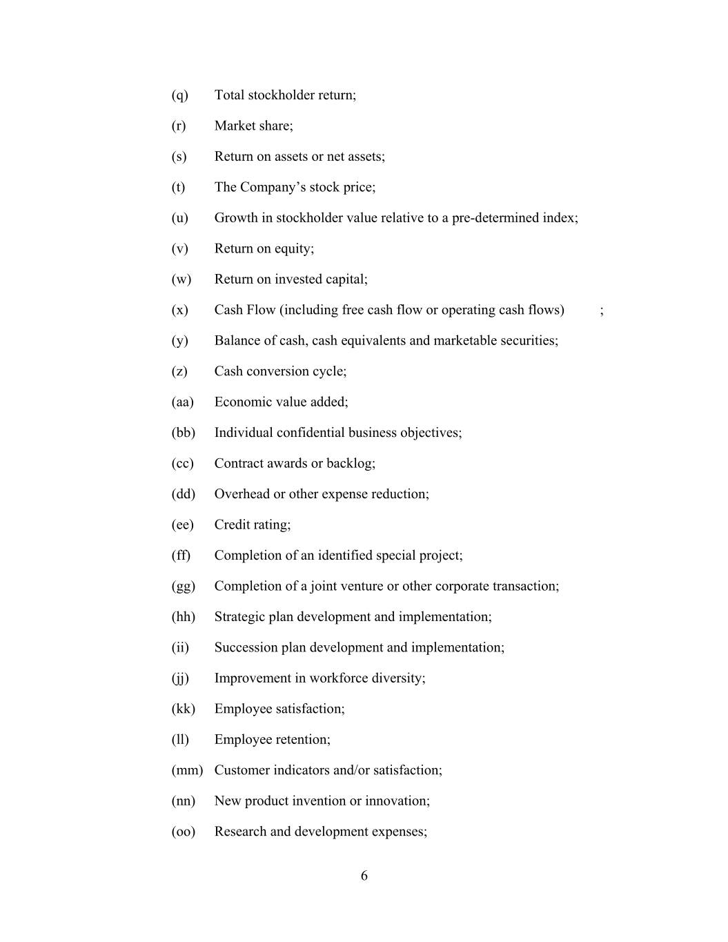 (q) Total stockholder return; (r) Market share; (s) Return on assets or net assets; (t) The Company’s stock price; (u) Growth in stockholder value relative to a pre-determined index; (v) Return on equity; (w) Return on invested capital; (x) Cash Flow (including free cash flow or operating cash flows) ; (y) Balance of cash, cash equivalents and marketable securities; (z) Cash conversion cycle; (aa) Economic value added; (bb) Individual confidential business objectives; (cc) Contract awards or backlog; (dd) Overhead or other expense reduction; (ee) Credit rating; (ff) Completion of an identified special project; (gg) Completion of a joint venture or other corporate transaction; (hh) Strategic plan development and implementation; (ii) Succession plan development and implementation; (jj) Improvement in workforce diversity; (kk) Employee satisfaction; (ll) Employee retention; (mm) Customer indicators and/or satisfaction; (nn) New product invention or innovation; (oo) Research and development expenses; 6