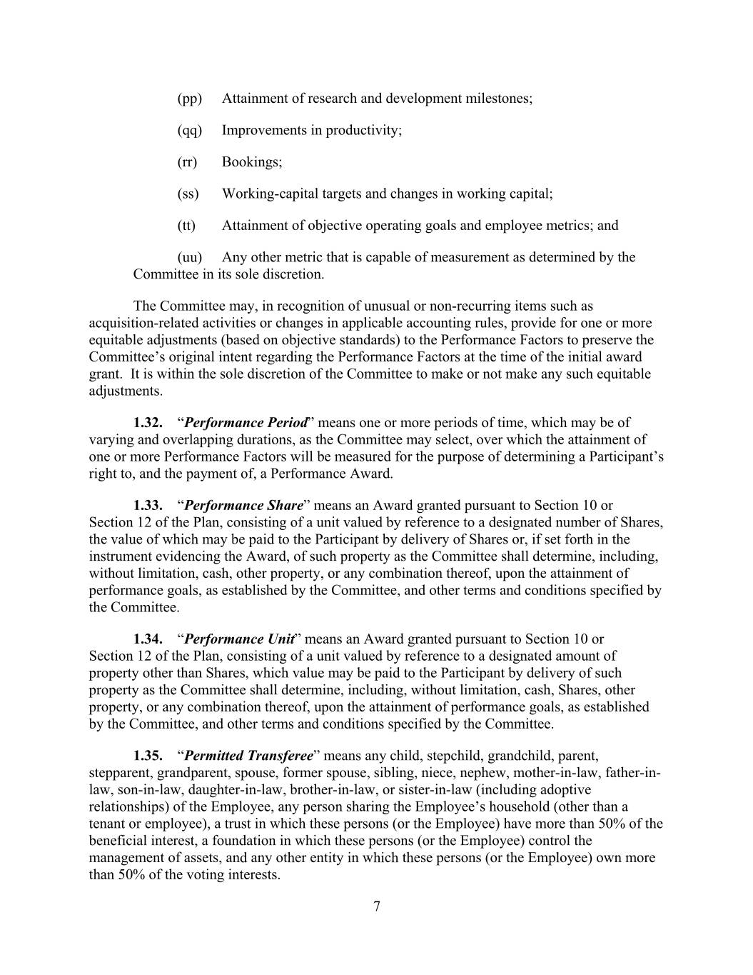 (pp) Attainment of research and development milestones; (qq) Improvements in productivity; (rr) Bookings; (ss) Working-capital targets and changes in working capital; (tt) Attainment of objective operating goals and employee metrics; and (uu) Any other metric that is capable of measurement as determined by the Committee in its sole discretion. The Committee may, in recognition of unusual or non-recurring items such as acquisition-related activities or changes in applicable accounting rules, provide for one or more equitable adjustments (based on objective standards) to the Performance Factors to preserve the Committee’s original intent regarding the Performance Factors at the time of the initial award grant. It is within the sole discretion of the Committee to make or not make any such equitable adjustments. 1.32. “Performance Period” means one or more periods of time, which may be of varying and overlapping durations, as the Committee may select, over which the attainment of one or more Performance Factors will be measured for the purpose of determining a Participant’s right to, and the payment of, a Performance Award. 1.33. “Performance Share” means an Award granted pursuant to Section 10 or Section 12 of the Plan, consisting of a unit valued by reference to a designated number of Shares, the value of which may be paid to the Participant by delivery of Shares or, if set forth in the instrument evidencing the Award, of such property as the Committee shall determine, including, without limitation, cash, other property, or any combination thereof, upon the attainment of performance goals, as established by the Committee, and other terms and conditions specified by the Committee. 1.34. “Performance Unit” means an Award granted pursuant to Section 10 or Section 12 of the Plan, consisting of a unit valued by reference to a designated amount of property other than Shares, which value may be paid to the Participant by delivery of such property as the Committee shall determine, including, without limitation, cash, Shares, other property, or any combination thereof, upon the attainment of performance goals, as established by the Committee, and other terms and conditions specified by the Committee. 1.35. “Permitted Transferee” means any child, stepchild, grandchild, parent, stepparent, grandparent, spouse, former spouse, sibling, niece, nephew, mother-in-law, father-in- law, son-in-law, daughter-in-law, brother-in-law, or sister-in-law (including adoptive relationships) of the Employee, any person sharing the Employee’s household (other than a tenant or employee), a trust in which these persons (or the Employee) have more than 50% of the beneficial interest, a foundation in which these persons (or the Employee) control the management of assets, and any other entity in which these persons (or the Employee) own more than 50% of the voting interests. 7
