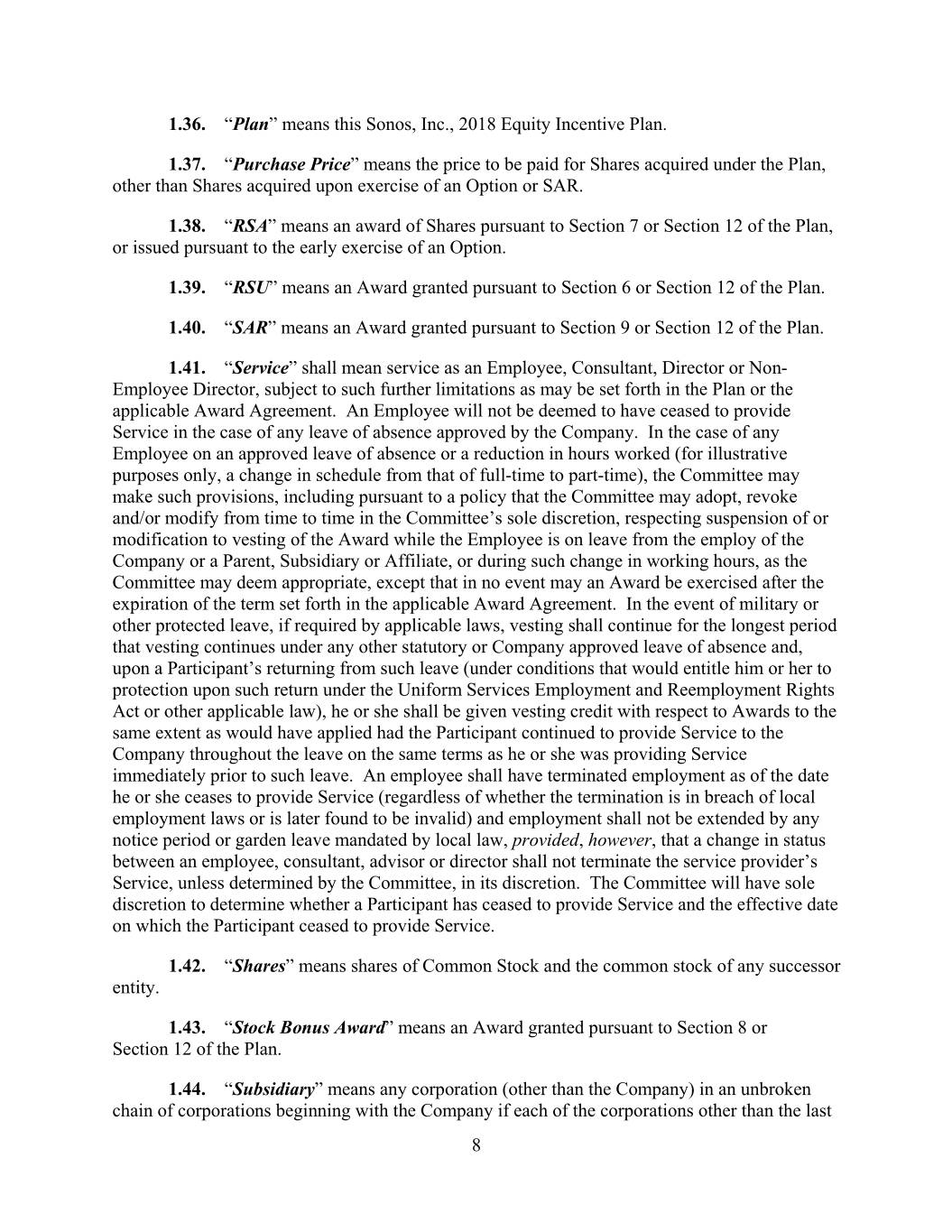 1.36. “Plan” means this Sonos, Inc., 2018 Equity Incentive Plan. 1.37. “Purchase Price” means the price to be paid for Shares acquired under the Plan, other than Shares acquired upon exercise of an Option or SAR. 1.38. “RSA” means an award of Shares pursuant to Section 7 or Section 12 of the Plan, or issued pursuant to the early exercise of an Option. 1.39. “RSU” means an Award granted pursuant to Section 6 or Section 12 of the Plan. 1.40. “SAR” means an Award granted pursuant to Section 9 or Section 12 of the Plan. 1.41. “Service” shall mean service as an Employee, Consultant, Director or Non- Employee Director, subject to such further limitations as may be set forth in the Plan or the applicable Award Agreement. An Employee will not be deemed to have ceased to provide Service in the case of any leave of absence approved by the Company. In the case of any Employee on an approved leave of absence or a reduction in hours worked (for illustrative purposes only, a change in schedule from that of full-time to part-time), the Committee may make such provisions, including pursuant to a policy that the Committee may adopt, revoke and/or modify from time to time in the Committee’s sole discretion, respecting suspension of or modification to vesting of the Award while the Employee is on leave from the employ of the Company or a Parent, Subsidiary or Affiliate, or during such change in working hours, as the Committee may deem appropriate, except that in no event may an Award be exercised after the expiration of the term set forth in the applicable Award Agreement. In the event of military or other protected leave, if required by applicable laws, vesting shall continue for the longest period that vesting continues under any other statutory or Company approved leave of absence and, upon a Participant’s returning from such leave (under conditions that would entitle him or her to protection upon such return under the Uniform Services Employment and Reemployment Rights Act or other applicable law), he or she shall be given vesting credit with respect to Awards to the same extent as would have applied had the Participant continued to provide Service to the Company throughout the leave on the same terms as he or she was providing Service immediately prior to such leave. An employee shall have terminated employment as of the date he or she ceases to provide Service (regardless of whether the termination is in breach of local employment laws or is later found to be invalid) and employment shall not be extended by any notice period or garden leave mandated by local law, provided, however, that a change in status between an employee, consultant, advisor or director shall not terminate the service provider’s Service, unless determined by the Committee, in its discretion. The Committee will have sole discretion to determine whether a Participant has ceased to provide Service and the effective date on which the Participant ceased to provide Service. 1.42. “Shares” means shares of Common Stock and the common stock of any successor entity. 1.43. “Stock Bonus Award” means an Award granted pursuant to Section 8 or Section 12 of the Plan. 1.44. “Subsidiary” means any corporation (other than the Company) in an unbroken chain of corporations beginning with the Company if each of the corporations other than the last 8