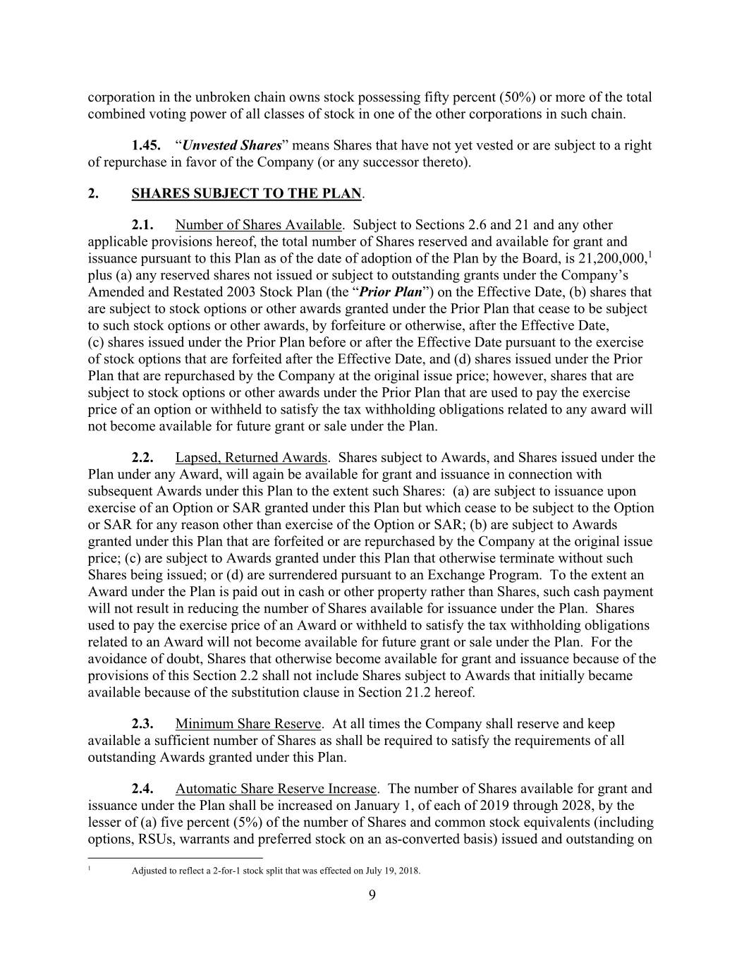 corporation in the unbroken chain owns stock possessing fifty percent (50%) or more of the total combined voting power of all classes of stock in one of the other corporations in such chain. 1.45. “Unvested Shares” means Shares that have not yet vested or are subject to a right of repurchase in favor of the Company (or any successor thereto). 2. SHARES SUBJECT TO THE PLAN. 2.1. Number of Shares Available. Subject to Sections 2.6 and 21 and any other applicable provisions hereof, the total number of Shares reserved and available for grant and issuance pursuant to this Plan as of the date of adoption of the Plan by the Board, is 21,200,000,1 plus (a) any reserved shares not issued or subject to outstanding grants under the Company’s Amended and Restated 2003 Stock Plan (the “Prior Plan”) on the Effective Date, (b) shares that are subject to stock options or other awards granted under the Prior Plan that cease to be subject to such stock options or other awards, by forfeiture or otherwise, after the Effective Date, (c) shares issued under the Prior Plan before or after the Effective Date pursuant to the exercise of stock options that are forfeited after the Effective Date, and (d) shares issued under the Prior Plan that are repurchased by the Company at the original issue price; however, shares that are subject to stock options or other awards under the Prior Plan that are used to pay the exercise price of an option or withheld to satisfy the tax withholding obligations related to any award will not become available for future grant or sale under the Plan. 2.2. Lapsed, Returned Awards. Shares subject to Awards, and Shares issued under the Plan under any Award, will again be available for grant and issuance in connection with subsequent Awards under this Plan to the extent such Shares: (a) are subject to issuance upon exercise of an Option or SAR granted under this Plan but which cease to be subject to the Option or SAR for any reason other than exercise of the Option or SAR; (b) are subject to Awards granted under this Plan that are forfeited or are repurchased by the Company at the original issue price; (c) are subject to Awards granted under this Plan that otherwise terminate without such Shares being issued; or (d) are surrendered pursuant to an Exchange Program. To the extent an Award under the Plan is paid out in cash or other property rather than Shares, such cash payment will not result in reducing the number of Shares available for issuance under the Plan. Shares used to pay the exercise price of an Award or withheld to satisfy the tax withholding obligations related to an Award will not become available for future grant or sale under the Plan. For the avoidance of doubt, Shares that otherwise become available for grant and issuance because of the provisions of this Section 2.2 shall not include Shares subject to Awards that initially became available because of the substitution clause in Section 21.2 hereof. 2.3. Minimum Share Reserve. At all times the Company shall reserve and keep available a sufficient number of Shares as shall be required to satisfy the requirements of all outstanding Awards granted under this Plan. 2.4. Automatic Share Reserve Increase. The number of Shares available for grant and issuance under the Plan shall be increased on January 1, of each of 2019 through 2028, by the lesser of (a) five percent (5%) of the number of Shares and common stock equivalents (including options, RSUs, warrants and preferred stock on an as-converted basis) issued and outstanding on 1 Adjusted to reflect a 2-for-1 stock split that was effected on July 19, 2018. 9