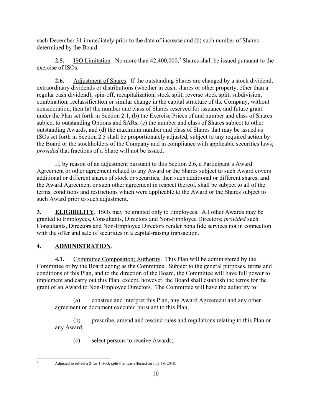 each December 31 immediately prior to the date of increase and (b) such number of Shares determined by the Board. 2.5. ISO Limitation. No more than 42,400,000,2 Shares shall be issued pursuant to the exercise of ISOs. 2.6. Adjustment of Shares. If the outstanding Shares are changed by a stock dividend, extraordinary dividends or distributions (whether in cash, shares or other property, other than a regular cash dividend), spin-off, recapitalization, stock split, reverse stock split, subdivision, combination, reclassification or similar change in the capital structure of the Company, without consideration, then (a) the number and class of Shares reserved for issuance and future grant under the Plan set forth in Section 2.1, (b) the Exercise Prices of and number and class of Shares subject to outstanding Options and SARs, (c) the number and class of Shares subject to other outstanding Awards, and (d) the maximum number and class of Shares that may be issued as ISOs set forth in Section 2.5 shall be proportionately adjusted, subject to any required action by the Board or the stockholders of the Company and in compliance with applicable securities laws; provided that fractions of a Share will not be issued. If, by reason of an adjustment pursuant to this Section 2.6, a Participant’s Award Agreement or other agreement related to any Award or the Shares subject to such Award covers additional or different shares of stock or securities, then such additional or different shares, and the Award Agreement or such other agreement in respect thereof, shall be subject to all of the terms, conditions and restrictions which were applicable to the Award or the Shares subject to such Award prior to such adjustment. 3. ELIGIBILITY. ISOs may be granted only to Employees. All other Awards may be granted to Employees, Consultants, Directors and Non-Employee Directors; provided such Consultants, Directors and Non-Employee Directors render bona fide services not in connection with the offer and sale of securities in a capital-raising transaction. 4. ADMINISTRATION. 4.1. Committee Composition; Authority. This Plan will be administered by the Committee or by the Board acting as the Committee. Subject to the general purposes, terms and conditions of this Plan, and to the direction of the Board, the Committee will have full power to implement and carry out this Plan, except, however, the Board shall establish the terms for the grant of an Award to Non-Employee Directors. The Committee will have the authority to: (a) construe and interpret this Plan, any Award Agreement and any other agreement or document executed pursuant to this Plan; (b) prescribe, amend and rescind rules and regulations relating to this Plan or any Award; (c) select persons to receive Awards; 2 Adjusted to reflect a 2-for-1 stock split that was effected on July 19, 2018. 10