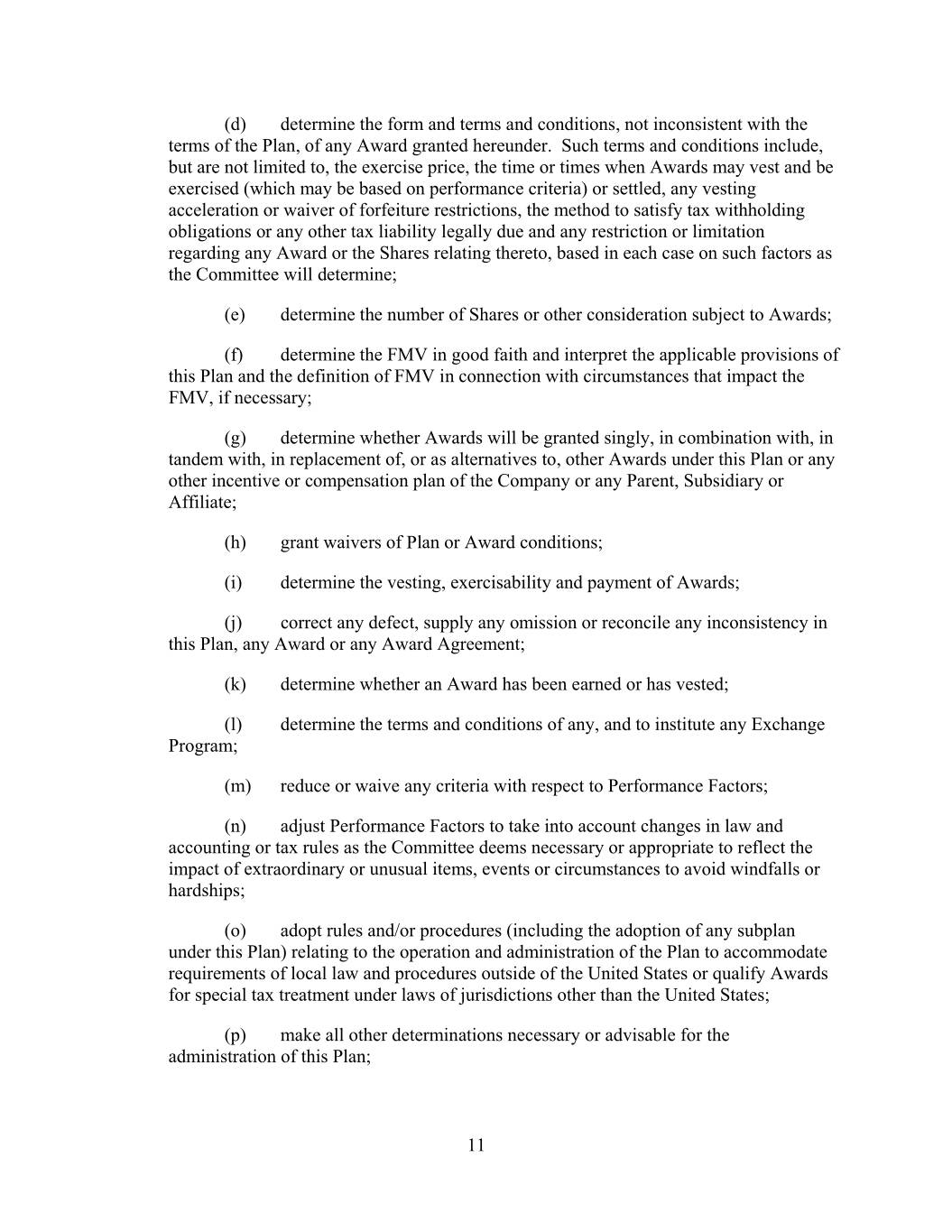 (d) determine the form and terms and conditions, not inconsistent with the terms of the Plan, of any Award granted hereunder. Such terms and conditions include, but are not limited to, the exercise price, the time or times when Awards may vest and be exercised (which may be based on performance criteria) or settled, any vesting acceleration or waiver of forfeiture restrictions, the method to satisfy tax withholding obligations or any other tax liability legally due and any restriction or limitation regarding any Award or the Shares relating thereto, based in each case on such factors as the Committee will determine; (e) determine the number of Shares or other consideration subject to Awards; (f) determine the FMV in good faith and interpret the applicable provisions of this Plan and the definition of FMV in connection with circumstances that impact the FMV, if necessary; (g) determine whether Awards will be granted singly, in combination with, in tandem with, in replacement of, or as alternatives to, other Awards under this Plan or any other incentive or compensation plan of the Company or any Parent, Subsidiary or Affiliate; (h) grant waivers of Plan or Award conditions; (i) determine the vesting, exercisability and payment of Awards; (j) correct any defect, supply any omission or reconcile any inconsistency in this Plan, any Award or any Award Agreement; (k) determine whether an Award has been earned or has vested; (l) determine the terms and conditions of any, and to institute any Exchange Program; (m) reduce or waive any criteria with respect to Performance Factors; (n) adjust Performance Factors to take into account changes in law and accounting or tax rules as the Committee deems necessary or appropriate to reflect the impact of extraordinary or unusual items, events or circumstances to avoid windfalls or hardships; (o) adopt rules and/or procedures (including the adoption of any subplan under this Plan) relating to the operation and administration of the Plan to accommodate requirements of local law and procedures outside of the United States or qualify Awards for special tax treatment under laws of jurisdictions other than the United States; (p) make all other determinations necessary or advisable for the administration of this Plan; 11