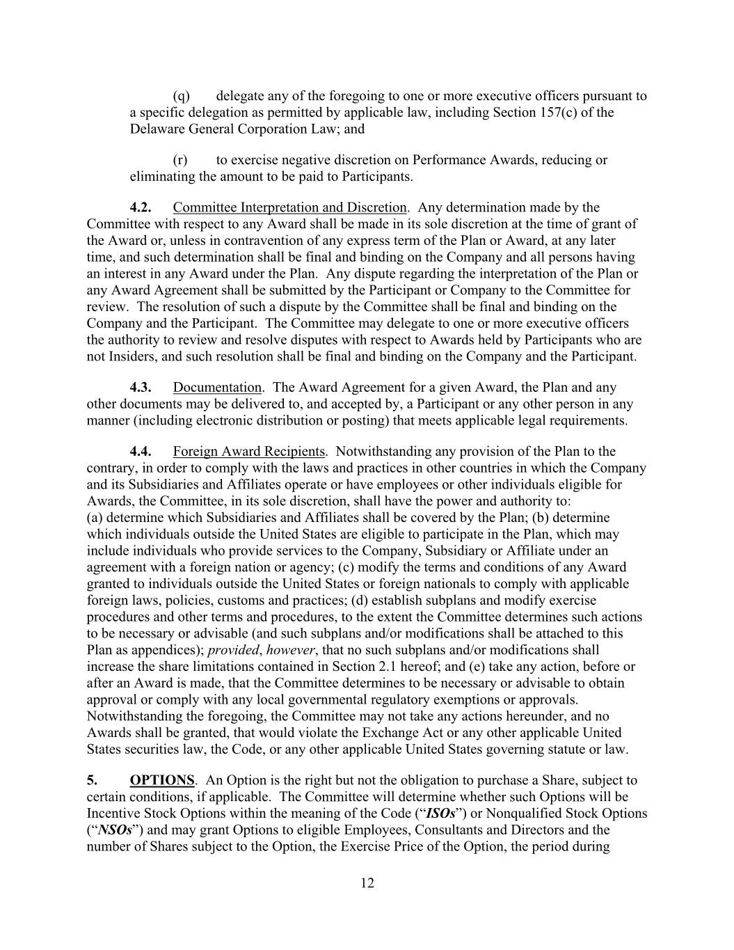 (q) delegate any of the foregoing to one or more executive officers pursuant to a specific delegation as permitted by applicable law, including Section 157(c) of the Delaware General Corporation Law; and (r) to exercise negative discretion on Performance Awards, reducing or eliminating the amount to be paid to Participants. 4.2. Committee Interpretation and Discretion. Any determination made by the Committee with respect to any Award shall be made in its sole discretion at the time of grant of the Award or, unless in contravention of any express term of the Plan or Award, at any later time, and such determination shall be final and binding on the Company and all persons having an interest in any Award under the Plan. Any dispute regarding the interpretation of the Plan or any Award Agreement shall be submitted by the Participant or Company to the Committee for review. The resolution of such a dispute by the Committee shall be final and binding on the Company and the Participant. The Committee may delegate to one or more executive officers the authority to review and resolve disputes with respect to Awards held by Participants who are not Insiders, and such resolution shall be final and binding on the Company and the Participant. 4.3. Documentation. The Award Agreement for a given Award, the Plan and any other documents may be delivered to, and accepted by, a Participant or any other person in any manner (including electronic distribution or posting) that meets applicable legal requirements. 4.4. Foreign Award Recipients. Notwithstanding any provision of the Plan to the contrary, in order to comply with the laws and practices in other countries in which the Company and its Subsidiaries and Affiliates operate or have employees or other individuals eligible for Awards, the Committee, in its sole discretion, shall have the power and authority to: (a) determine which Subsidiaries and Affiliates shall be covered by the Plan; (b) determine which individuals outside the United States are eligible to participate in the Plan, which may include individuals who provide services to the Company, Subsidiary or Affiliate under an agreement with a foreign nation or agency; (c) modify the terms and conditions of any Award granted to individuals outside the United States or foreign nationals to comply with applicable foreign laws, policies, customs and practices; (d) establish subplans and modify exercise procedures and other terms and procedures, to the extent the Committee determines such actions to be necessary or advisable (and such subplans and/or modifications shall be attached to this Plan as appendices); provided, however, that no such subplans and/or modifications shall increase the share limitations contained in Section 2.1 hereof; and (e) take any action, before or after an Award is made, that the Committee determines to be necessary or advisable to obtain approval or comply with any local governmental regulatory exemptions or approvals. Notwithstanding the foregoing, the Committee may not take any actions hereunder, and no Awards shall be granted, that would violate the Exchange Act or any other applicable United States securities law, the Code, or any other applicable United States governing statute or law. 5. OPTIONS. An Option is the right but not the obligation to purchase a Share, subject to certain conditions, if applicable. The Committee will determine whether such Options will be Incentive Stock Options within the meaning of the Code (“ISOs”) or Nonqualified Stock Options (“NSOs”) and may grant Options to eligible Employees, Consultants and Directors and the number of Shares subject to the Option, the Exercise Price of the Option, the period during 12