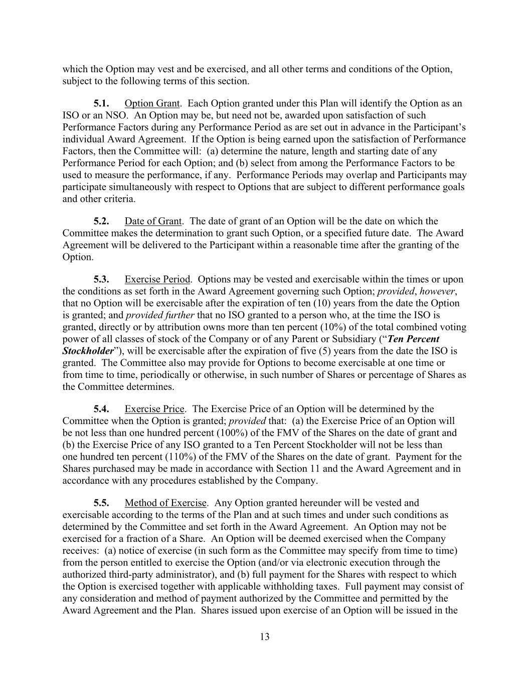 which the Option may vest and be exercised, and all other terms and conditions of the Option, subject to the following terms of this section. 5.1. Option Grant. Each Option granted under this Plan will identify the Option as an ISO or an NSO. An Option may be, but need not be, awarded upon satisfaction of such Performance Factors during any Performance Period as are set out in advance in the Participant’s individual Award Agreement. If the Option is being earned upon the satisfaction of Performance Factors, then the Committee will: (a) determine the nature, length and starting date of any Performance Period for each Option; and (b) select from among the Performance Factors to be used to measure the performance, if any. Performance Periods may overlap and Participants may participate simultaneously with respect to Options that are subject to different performance goals and other criteria. 5.2. Date of Grant. The date of grant of an Option will be the date on which the Committee makes the determination to grant such Option, or a specified future date. The Award Agreement will be delivered to the Participant within a reasonable time after the granting of the Option. 5.3. Exercise Period. Options may be vested and exercisable within the times or upon the conditions as set forth in the Award Agreement governing such Option; provided, however, that no Option will be exercisable after the expiration of ten (10) years from the date the Option is granted; and provided further that no ISO granted to a person who, at the time the ISO is granted, directly or by attribution owns more than ten percent (10%) of the total combined voting power of all classes of stock of the Company or of any Parent or Subsidiary (“Ten Percent Stockholder”), will be exercisable after the expiration of five (5) years from the date the ISO is granted. The Committee also may provide for Options to become exercisable at one time or from time to time, periodically or otherwise, in such number of Shares or percentage of Shares as the Committee determines. 5.4. Exercise Price. The Exercise Price of an Option will be determined by the Committee when the Option is granted; provided that: (a) the Exercise Price of an Option will be not less than one hundred percent (100%) of the FMV of the Shares on the date of grant and (b) the Exercise Price of any ISO granted to a Ten Percent Stockholder will not be less than one hundred ten percent (110%) of the FMV of the Shares on the date of grant. Payment for the Shares purchased may be made in accordance with Section 11 and the Award Agreement and in accordance with any procedures established by the Company. 5.5. Method of Exercise. Any Option granted hereunder will be vested and exercisable according to the terms of the Plan and at such times and under such conditions as determined by the Committee and set forth in the Award Agreement. An Option may not be exercised for a fraction of a Share. An Option will be deemed exercised when the Company receives: (a) notice of exercise (in such form as the Committee may specify from time to time) from the person entitled to exercise the Option (and/or via electronic execution through the authorized third-party administrator), and (b) full payment for the Shares with respect to which the Option is exercised together with applicable withholding taxes. Full payment may consist of any consideration and method of payment authorized by the Committee and permitted by the Award Agreement and the Plan. Shares issued upon exercise of an Option will be issued in the 13