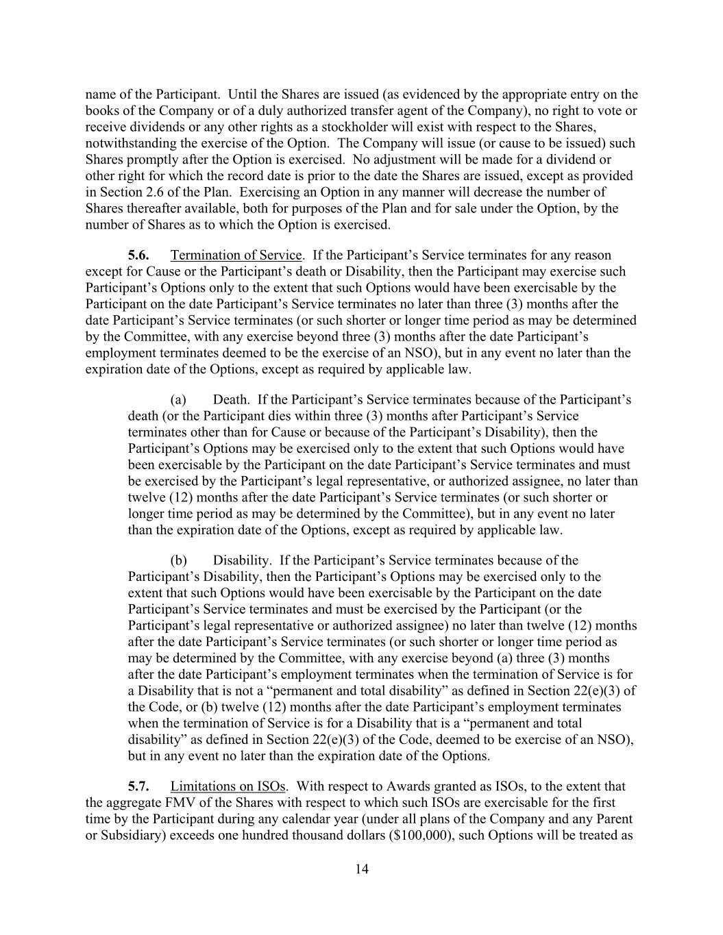 name of the Participant. Until the Shares are issued (as evidenced by the appropriate entry on the books of the Company or of a duly authorized transfer agent of the Company), no right to vote or receive dividends or any other rights as a stockholder will exist with respect to the Shares, notwithstanding the exercise of the Option. The Company will issue (or cause to be issued) such Shares promptly after the Option is exercised. No adjustment will be made for a dividend or other right for which the record date is prior to the date the Shares are issued, except as provided in Section 2.6 of the Plan. Exercising an Option in any manner will decrease the number of Shares thereafter available, both for purposes of the Plan and for sale under the Option, by the number of Shares as to which the Option is exercised. 5.6. Termination of Service. If the Participant’s Service terminates for any reason except for Cause or the Participant’s death or Disability, then the Participant may exercise such Participant’s Options only to the extent that such Options would have been exercisable by the Participant on the date Participant’s Service terminates no later than three (3) months after the date Participant’s Service terminates (or such shorter or longer time period as may be determined by the Committee, with any exercise beyond three (3) months after the date Participant’s employment terminates deemed to be the exercise of an NSO), but in any event no later than the expiration date of the Options, except as required by applicable law. (a) Death. If the Participant’s Service terminates because of the Participant’s death (or the Participant dies within three (3) months after Participant’s Service terminates other than for Cause or because of the Participant’s Disability), then the Participant’s Options may be exercised only to the extent that such Options would have been exercisable by the Participant on the date Participant’s Service terminates and must be exercised by the Participant’s legal representative, or authorized assignee, no later than twelve (12) months after the date Participant’s Service terminates (or such shorter or longer time period as may be determined by the Committee), but in any event no later than the expiration date of the Options, except as required by applicable law. (b) Disability. If the Participant’s Service terminates because of the Participant’s Disability, then the Participant’s Options may be exercised only to the extent that such Options would have been exercisable by the Participant on the date Participant’s Service terminates and must be exercised by the Participant (or the Participant’s legal representative or authorized assignee) no later than twelve (12) months after the date Participant’s Service terminates (or such shorter or longer time period as may be determined by the Committee, with any exercise beyond (a) three (3) months after the date Participant’s employment terminates when the termination of Service is for a Disability that is not a “permanent and total disability” as defined in Section 22(e)(3) of the Code, or (b) twelve (12) months after the date Participant’s employment terminates when the termination of Service is for a Disability that is a “permanent and total disability” as defined in Section 22(e)(3) of the Code, deemed to be exercise of an NSO), but in any event no later than the expiration date of the Options. 5.7. Limitations on ISOs. With respect to Awards granted as ISOs, to the extent that the aggregate FMV of the Shares with respect to which such ISOs are exercisable for the first time by the Participant during any calendar year (under all plans of the Company and any Parent or Subsidiary) exceeds one hundred thousand dollars ($100,000), such Options will be treated as 14