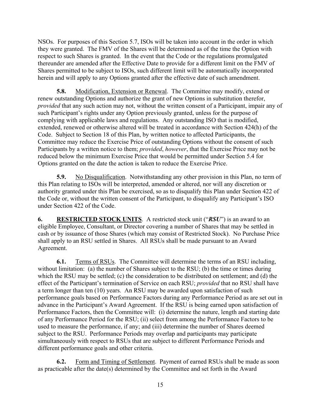 NSOs. For purposes of this Section 5.7, ISOs will be taken into account in the order in which they were granted. The FMV of the Shares will be determined as of the time the Option with respect to such Shares is granted. In the event that the Code or the regulations promulgated thereunder are amended after the Effective Date to provide for a different limit on the FMV of Shares permitted to be subject to ISOs, such different limit will be automatically incorporated herein and will apply to any Options granted after the effective date of such amendment. 5.8. Modification, Extension or Renewal. The Committee may modify, extend or renew outstanding Options and authorize the grant of new Options in substitution therefor, provided that any such action may not, without the written consent of a Participant, impair any of such Participant’s rights under any Option previously granted, unless for the purpose of complying with applicable laws and regulations. Any outstanding ISO that is modified, extended, renewed or otherwise altered will be treated in accordance with Section 424(h) of the Code. Subject to Section 18 of this Plan, by written notice to affected Participants, the Committee may reduce the Exercise Price of outstanding Options without the consent of such Participants by a written notice to them; provided, however, that the Exercise Price may not be reduced below the minimum Exercise Price that would be permitted under Section 5.4 for Options granted on the date the action is taken to reduce the Exercise Price. 5.9. No Disqualification. Notwithstanding any other provision in this Plan, no term of this Plan relating to ISOs will be interpreted, amended or altered, nor will any discretion or authority granted under this Plan be exercised, so as to disqualify this Plan under Section 422 of the Code or, without the written consent of the Participant, to disqualify any Participant’s ISO under Section 422 of the Code. 6. RESTRICTED STOCK UNITS. A restricted stock unit (“RSU”) is an award to an eligible Employee, Consultant, or Director covering a number of Shares that may be settled in cash or by issuance of those Shares (which may consist of Restricted Stock). No Purchase Price shall apply to an RSU settled in Shares. All RSUs shall be made pursuant to an Award Agreement. 6.1. Terms of RSUs. The Committee will determine the terms of an RSU including, without limitation: (a) the number of Shares subject to the RSU; (b) the time or times during which the RSU may be settled; (c) the consideration to be distributed on settlement; and (d) the effect of the Participant’s termination of Service on each RSU; provided that no RSU shall have a term longer than ten (10) years. An RSU may be awarded upon satisfaction of such performance goals based on Performance Factors during any Performance Period as are set out in advance in the Participant’s Award Agreement. If the RSU is being earned upon satisfaction of Performance Factors, then the Committee will: (i) determine the nature, length and starting date of any Performance Period for the RSU; (ii) select from among the Performance Factors to be used to measure the performance, if any; and (iii) determine the number of Shares deemed subject to the RSU. Performance Periods may overlap and participants may participate simultaneously with respect to RSUs that are subject to different Performance Periods and different performance goals and other criteria. 6.2. Form and Timing of Settlement. Payment of earned RSUs shall be made as soon as practicable after the date(s) determined by the Committee and set forth in the Award 15