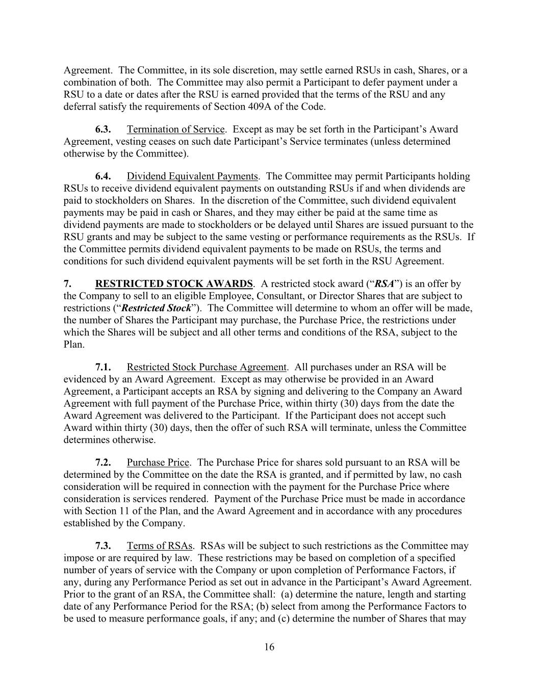 Agreement. The Committee, in its sole discretion, may settle earned RSUs in cash, Shares, or a combination of both. The Committee may also permit a Participant to defer payment under a RSU to a date or dates after the RSU is earned provided that the terms of the RSU and any deferral satisfy the requirements of Section 409A of the Code. 6.3. Termination of Service. Except as may be set forth in the Participant’s Award Agreement, vesting ceases on such date Participant’s Service terminates (unless determined otherwise by the Committee). 6.4. Dividend Equivalent Payments. The Committee may permit Participants holding RSUs to receive dividend equivalent payments on outstanding RSUs if and when dividends are paid to stockholders on Shares. In the discretion of the Committee, such dividend equivalent payments may be paid in cash or Shares, and they may either be paid at the same time as dividend payments are made to stockholders or be delayed until Shares are issued pursuant to the RSU grants and may be subject to the same vesting or performance requirements as the RSUs. If the Committee permits dividend equivalent payments to be made on RSUs, the terms and conditions for such dividend equivalent payments will be set forth in the RSU Agreement. 7. RESTRICTED STOCK AWARDS. A restricted stock award (“RSA”) is an offer by the Company to sell to an eligible Employee, Consultant, or Director Shares that are subject to restrictions (“Restricted Stock”). The Committee will determine to whom an offer will be made, the number of Shares the Participant may purchase, the Purchase Price, the restrictions under which the Shares will be subject and all other terms and conditions of the RSA, subject to the Plan. 7.1. Restricted Stock Purchase Agreement. All purchases under an RSA will be evidenced by an Award Agreement. Except as may otherwise be provided in an Award Agreement, a Participant accepts an RSA by signing and delivering to the Company an Award Agreement with full payment of the Purchase Price, within thirty (30) days from the date the Award Agreement was delivered to the Participant. If the Participant does not accept such Award within thirty (30) days, then the offer of such RSA will terminate, unless the Committee determines otherwise. 7.2. Purchase Price. The Purchase Price for shares sold pursuant to an RSA will be determined by the Committee on the date the RSA is granted, and if permitted by law, no cash consideration will be required in connection with the payment for the Purchase Price where consideration is services rendered. Payment of the Purchase Price must be made in accordance with Section 11 of the Plan, and the Award Agreement and in accordance with any procedures established by the Company. 7.3. Terms of RSAs. RSAs will be subject to such restrictions as the Committee may impose or are required by law. These restrictions may be based on completion of a specified number of years of service with the Company or upon completion of Performance Factors, if any, during any Performance Period as set out in advance in the Participant’s Award Agreement. Prior to the grant of an RSA, the Committee shall: (a) determine the nature, length and starting date of any Performance Period for the RSA; (b) select from among the Performance Factors to be used to measure performance goals, if any; and (c) determine the number of Shares that may 16