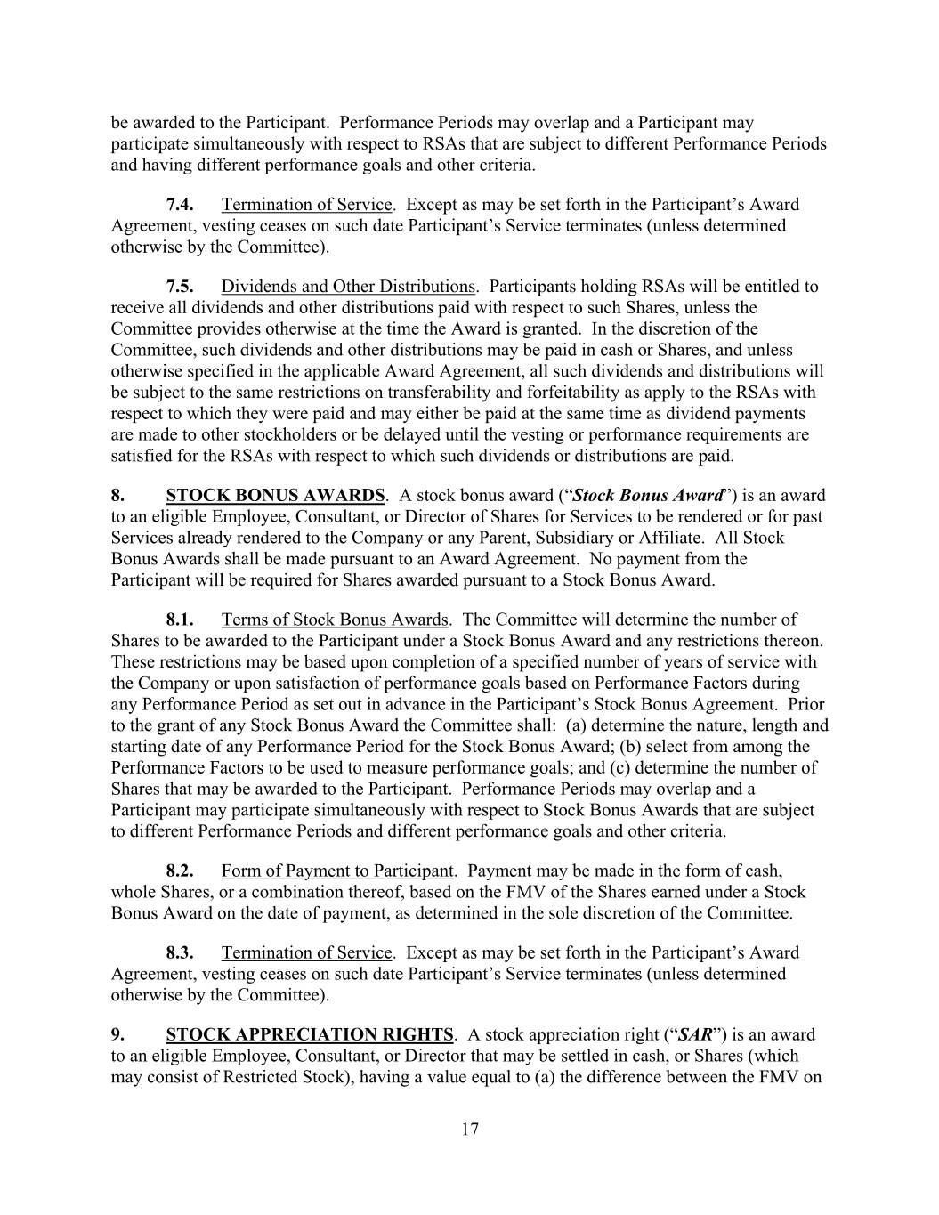 be awarded to the Participant. Performance Periods may overlap and a Participant may participate simultaneously with respect to RSAs that are subject to different Performance Periods and having different performance goals and other criteria. 7.4. Termination of Service. Except as may be set forth in the Participant’s Award Agreement, vesting ceases on such date Participant’s Service terminates (unless determined otherwise by the Committee). 7.5. Dividends and Other Distributions. Participants holding RSAs will be entitled to receive all dividends and other distributions paid with respect to such Shares, unless the Committee provides otherwise at the time the Award is granted. In the discretion of the Committee, such dividends and other distributions may be paid in cash or Shares, and unless otherwise specified in the applicable Award Agreement, all such dividends and distributions will be subject to the same restrictions on transferability and forfeitability as apply to the RSAs with respect to which they were paid and may either be paid at the same time as dividend payments are made to other stockholders or be delayed until the vesting or performance requirements are satisfied for the RSAs with respect to which such dividends or distributions are paid. 8. STOCK BONUS AWARDS. A stock bonus award (“Stock Bonus Award”) is an award to an eligible Employee, Consultant, or Director of Shares for Services to be rendered or for past Services already rendered to the Company or any Parent, Subsidiary or Affiliate. All Stock Bonus Awards shall be made pursuant to an Award Agreement. No payment from the Participant will be required for Shares awarded pursuant to a Stock Bonus Award. 8.1. Terms of Stock Bonus Awards. The Committee will determine the number of Shares to be awarded to the Participant under a Stock Bonus Award and any restrictions thereon. These restrictions may be based upon completion of a specified number of years of service with the Company or upon satisfaction of performance goals based on Performance Factors during any Performance Period as set out in advance in the Participant’s Stock Bonus Agreement. Prior to the grant of any Stock Bonus Award the Committee shall: (a) determine the nature, length and starting date of any Performance Period for the Stock Bonus Award; (b) select from among the Performance Factors to be used to measure performance goals; and (c) determine the number of Shares that may be awarded to the Participant. Performance Periods may overlap and a Participant may participate simultaneously with respect to Stock Bonus Awards that are subject to different Performance Periods and different performance goals and other criteria. 8.2. Form of Payment to Participant. Payment may be made in the form of cash, whole Shares, or a combination thereof, based on the FMV of the Shares earned under a Stock Bonus Award on the date of payment, as determined in the sole discretion of the Committee. 8.3. Termination of Service. Except as may be set forth in the Participant’s Award Agreement, vesting ceases on such date Participant’s Service terminates (unless determined otherwise by the Committee). 9. STOCK APPRECIATION RIGHTS. A stock appreciation right (“SAR”) is an award to an eligible Employee, Consultant, or Director that may be settled in cash, or Shares (which may consist of Restricted Stock), having a value equal to (a) the difference between the FMV on 17