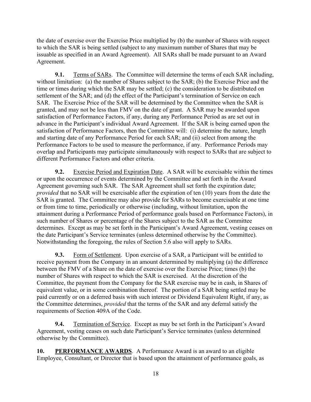 the date of exercise over the Exercise Price multiplied by (b) the number of Shares with respect to which the SAR is being settled (subject to any maximum number of Shares that may be issuable as specified in an Award Agreement). All SARs shall be made pursuant to an Award Agreement. 9.1. Terms of SARs. The Committee will determine the terms of each SAR including, without limitation: (a) the number of Shares subject to the SAR; (b) the Exercise Price and the time or times during which the SAR may be settled; (c) the consideration to be distributed on settlement of the SAR; and (d) the effect of the Participant’s termination of Service on each SAR. The Exercise Price of the SAR will be determined by the Committee when the SAR is granted, and may not be less than FMV on the date of grant. A SAR may be awarded upon satisfaction of Performance Factors, if any, during any Performance Period as are set out in advance in the Participant’s individual Award Agreement. If the SAR is being earned upon the satisfaction of Performance Factors, then the Committee will: (i) determine the nature, length and starting date of any Performance Period for each SAR; and (ii) select from among the Performance Factors to be used to measure the performance, if any. Performance Periods may overlap and Participants may participate simultaneously with respect to SARs that are subject to different Performance Factors and other criteria. 9.2. Exercise Period and Expiration Date. A SAR will be exercisable within the times or upon the occurrence of events determined by the Committee and set forth in the Award Agreement governing such SAR. The SAR Agreement shall set forth the expiration date; provided that no SAR will be exercisable after the expiration of ten (10) years from the date the SAR is granted. The Committee may also provide for SARs to become exercisable at one time or from time to time, periodically or otherwise (including, without limitation, upon the attainment during a Performance Period of performance goals based on Performance Factors), in such number of Shares or percentage of the Shares subject to the SAR as the Committee determines. Except as may be set forth in the Participant’s Award Agreement, vesting ceases on the date Participant’s Service terminates (unless determined otherwise by the Committee). Notwithstanding the foregoing, the rules of Section 5.6 also will apply to SARs. 9.3. Form of Settlement. Upon exercise of a SAR, a Participant will be entitled to receive payment from the Company in an amount determined by multiplying (a) the difference between the FMV of a Share on the date of exercise over the Exercise Price; times (b) the number of Shares with respect to which the SAR is exercised. At the discretion of the Committee, the payment from the Company for the SAR exercise may be in cash, in Shares of equivalent value, or in some combination thereof. The portion of a SAR being settled may be paid currently or on a deferred basis with such interest or Dividend Equivalent Right, if any, as the Committee determines, provided that the terms of the SAR and any deferral satisfy the requirements of Section 409A of the Code. 9.4. Termination of Service. Except as may be set forth in the Participant’s Award Agreement, vesting ceases on such date Participant’s Service terminates (unless determined otherwise by the Committee). 10. PERFORMANCE AWARDS. A Performance Award is an award to an eligible Employee, Consultant, or Director that is based upon the attainment of performance goals, as 18