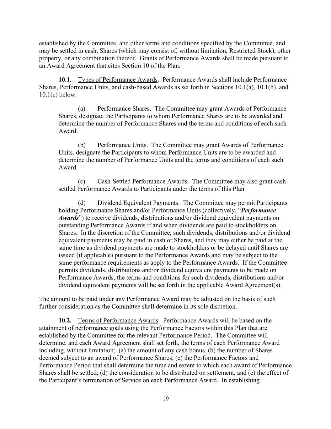 established by the Committee, and other terms and conditions specified by the Committee, and may be settled in cash, Shares (which may consist of, without limitation, Restricted Stock), other property, or any combination thereof. Grants of Performance Awards shall be made pursuant to an Award Agreement that cites Section 10 of the Plan. 10.1. Types of Performance Awards. Performance Awards shall include Performance Shares, Performance Units, and cash-based Awards as set forth in Sections 10.1(a), 10.1(b), and 10.1(c) below. (a) Performance Shares. The Committee may grant Awards of Performance Shares, designate the Participants to whom Performance Shares are to be awarded and determine the number of Performance Shares and the terms and conditions of each such Award. (b) Performance Units. The Committee may grant Awards of Performance Units, designate the Participants to whom Performance Units are to be awarded and determine the number of Performance Units and the terms and conditions of each such Award. (c) Cash-Settled Performance Awards. The Committee may also grant cash- settled Performance Awards to Participants under the terms of this Plan. (d) Dividend Equivalent Payments. The Committee may permit Participants holding Performance Shares and/or Performance Units (collectively, “Performance Awards”) to receive dividends, distributions and/or dividend equivalent payments on outstanding Performance Awards if and when dividends are paid to stockholders on Shares. In the discretion of the Committee, such dividends, distributions and/or dividend equivalent payments may be paid in cash or Shares, and they may either be paid at the same time as dividend payments are made to stockholders or be delayed until Shares are issued (if applicable) pursuant to the Performance Awards and may be subject to the same performance requirements as apply to the Performance Awards. If the Committee permits dividends, distributions and/or dividend equivalent payments to be made on Performance Awards, the terms and conditions for such dividends, distributions and/or dividend equivalent payments will be set forth in the applicable Award Agreement(s). The amount to be paid under any Performance Award may be adjusted on the basis of such further consideration as the Committee shall determine in its sole discretion. 10.2. Terms of Performance Awards. Performance Awards will be based on the attainment of performance goals using the Performance Factors within this Plan that are established by the Committee for the relevant Performance Period. The Committee will determine, and each Award Agreement shall set forth, the terms of each Performance Award including, without limitation: (a) the amount of any cash bonus, (b) the number of Shares deemed subject to an award of Performance Shares; (c) the Performance Factors and Performance Period that shall determine the time and extent to which each award of Performance Shares shall be settled; (d) the consideration to be distributed on settlement, and (e) the effect of the Participant’s termination of Service on each Performance Award. In establishing 19