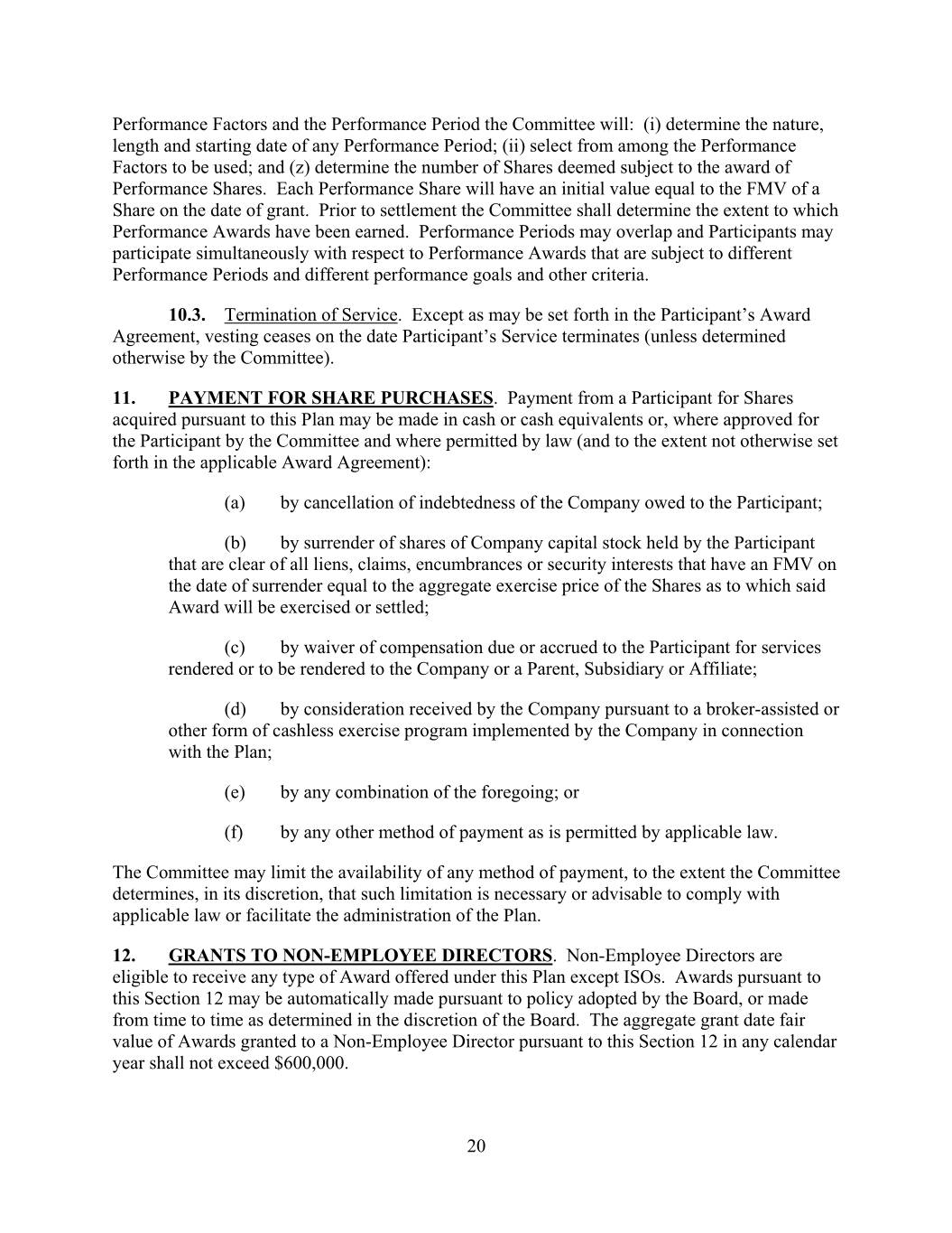 Performance Factors and the Performance Period the Committee will: (i) determine the nature, length and starting date of any Performance Period; (ii) select from among the Performance Factors to be used; and (z) determine the number of Shares deemed subject to the award of Performance Shares. Each Performance Share will have an initial value equal to the FMV of a Share on the date of grant. Prior to settlement the Committee shall determine the extent to which Performance Awards have been earned. Performance Periods may overlap and Participants may participate simultaneously with respect to Performance Awards that are subject to different Performance Periods and different performance goals and other criteria. 10.3. Termination of Service. Except as may be set forth in the Participant’s Award Agreement, vesting ceases on the date Participant’s Service terminates (unless determined otherwise by the Committee). 11. PAYMENT FOR SHARE PURCHASES. Payment from a Participant for Shares acquired pursuant to this Plan may be made in cash or cash equivalents or, where approved for the Participant by the Committee and where permitted by law (and to the extent not otherwise set forth in the applicable Award Agreement): (a) by cancellation of indebtedness of the Company owed to the Participant; (b) by surrender of shares of Company capital stock held by the Participant that are clear of all liens, claims, encumbrances or security interests that have an FMV on the date of surrender equal to the aggregate exercise price of the Shares as to which said Award will be exercised or settled; (c) by waiver of compensation due or accrued to the Participant for services rendered or to be rendered to the Company or a Parent, Subsidiary or Affiliate; (d) by consideration received by the Company pursuant to a broker-assisted or other form of cashless exercise program implemented by the Company in connection with the Plan; (e) by any combination of the foregoing; or (f) by any other method of payment as is permitted by applicable law. The Committee may limit the availability of any method of payment, to the extent the Committee determines, in its discretion, that such limitation is necessary or advisable to comply with applicable law or facilitate the administration of the Plan. 12. GRANTS TO NON-EMPLOYEE DIRECTORS. Non-Employee Directors are eligible to receive any type of Award offered under this Plan except ISOs. Awards pursuant to this Section 12 may be automatically made pursuant to policy adopted by the Board, or made from time to time as determined in the discretion of the Board. The aggregate grant date fair value of Awards granted to a Non-Employee Director pursuant to this Section 12 in any calendar year shall not exceed $600,000. 20