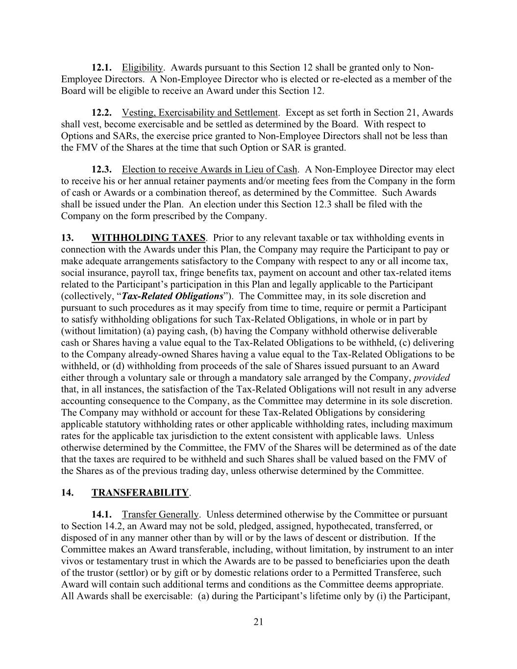 12.1. Eligibility. Awards pursuant to this Section 12 shall be granted only to Non- Employee Directors. A Non-Employee Director who is elected or re-elected as a member of the Board will be eligible to receive an Award under this Section 12. 12.2. Vesting, Exercisability and Settlement. Except as set forth in Section 21, Awards shall vest, become exercisable and be settled as determined by the Board. With respect to Options and SARs, the exercise price granted to Non-Employee Directors shall not be less than the FMV of the Shares at the time that such Option or SAR is granted. 12.3. Election to receive Awards in Lieu of Cash. A Non-Employee Director may elect to receive his or her annual retainer payments and/or meeting fees from the Company in the form of cash or Awards or a combination thereof, as determined by the Committee. Such Awards shall be issued under the Plan. An election under this Section 12.3 shall be filed with the Company on the form prescribed by the Company. 13. WITHHOLDING TAXES. Prior to any relevant taxable or tax withholding events in connection with the Awards under this Plan, the Company may require the Participant to pay or make adequate arrangements satisfactory to the Company with respect to any or all income tax, social insurance, payroll tax, fringe benefits tax, payment on account and other tax-related items related to the Participant’s participation in this Plan and legally applicable to the Participant (collectively, “Tax-Related Obligations”). The Committee may, in its sole discretion and pursuant to such procedures as it may specify from time to time, require or permit a Participant to satisfy withholding obligations for such Tax-Related Obligations, in whole or in part by (without limitation) (a) paying cash, (b) having the Company withhold otherwise deliverable cash or Shares having a value equal to the Tax-Related Obligations to be withheld, (c) delivering to the Company already-owned Shares having a value equal to the Tax-Related Obligations to be withheld, or (d) withholding from proceeds of the sale of Shares issued pursuant to an Award either through a voluntary sale or through a mandatory sale arranged by the Company, provided that, in all instances, the satisfaction of the Tax-Related Obligations will not result in any adverse accounting consequence to the Company, as the Committee may determine in its sole discretion. The Company may withhold or account for these Tax-Related Obligations by considering applicable statutory withholding rates or other applicable withholding rates, including maximum rates for the applicable tax jurisdiction to the extent consistent with applicable laws. Unless otherwise determined by the Committee, the FMV of the Shares will be determined as of the date that the taxes are required to be withheld and such Shares shall be valued based on the FMV of the Shares as of the previous trading day, unless otherwise determined by the Committee. 14. TRANSFERABILITY. 14.1. Transfer Generally. Unless determined otherwise by the Committee or pursuant to Section 14.2, an Award may not be sold, pledged, assigned, hypothecated, transferred, or disposed of in any manner other than by will or by the laws of descent or distribution. If the Committee makes an Award transferable, including, without limitation, by instrument to an inter vivos or testamentary trust in which the Awards are to be passed to beneficiaries upon the death of the trustor (settlor) or by gift or by domestic relations order to a Permitted Transferee, such Award will contain such additional terms and conditions as the Committee deems appropriate. All Awards shall be exercisable: (a) during the Participant’s lifetime only by (i) the Participant, 21