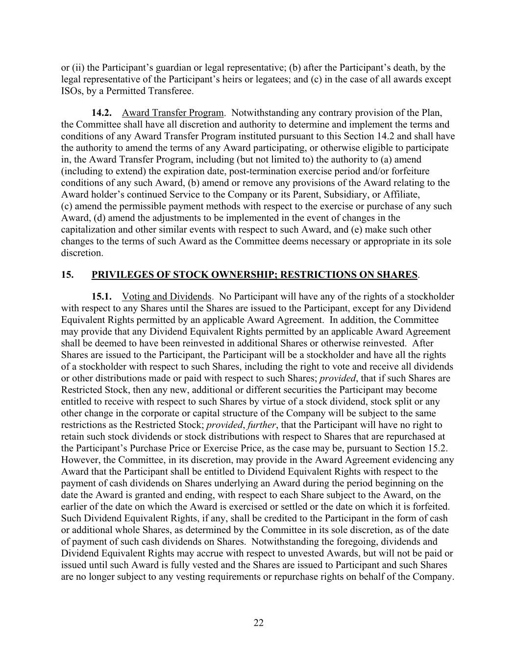 or (ii) the Participant’s guardian or legal representative; (b) after the Participant’s death, by the legal representative of the Participant’s heirs or legatees; and (c) in the case of all awards except ISOs, by a Permitted Transferee. 14.2. Award Transfer Program. Notwithstanding any contrary provision of the Plan, the Committee shall have all discretion and authority to determine and implement the terms and conditions of any Award Transfer Program instituted pursuant to this Section 14.2 and shall have the authority to amend the terms of any Award participating, or otherwise eligible to participate in, the Award Transfer Program, including (but not limited to) the authority to (a) amend (including to extend) the expiration date, post-termination exercise period and/or forfeiture conditions of any such Award, (b) amend or remove any provisions of the Award relating to the Award holder’s continued Service to the Company or its Parent, Subsidiary, or Affiliate, (c) amend the permissible payment methods with respect to the exercise or purchase of any such Award, (d) amend the adjustments to be implemented in the event of changes in the capitalization and other similar events with respect to such Award, and (e) make such other changes to the terms of such Award as the Committee deems necessary or appropriate in its sole discretion. 15. PRIVILEGES OF STOCK OWNERSHIP; RESTRICTIONS ON SHARES. 15.1. Voting and Dividends. No Participant will have any of the rights of a stockholder with respect to any Shares until the Shares are issued to the Participant, except for any Dividend Equivalent Rights permitted by an applicable Award Agreement. In addition, the Committee may provide that any Dividend Equivalent Rights permitted by an applicable Award Agreement shall be deemed to have been reinvested in additional Shares or otherwise reinvested. After Shares are issued to the Participant, the Participant will be a stockholder and have all the rights of a stockholder with respect to such Shares, including the right to vote and receive all dividends or other distributions made or paid with respect to such Shares; provided, that if such Shares are Restricted Stock, then any new, additional or different securities the Participant may become entitled to receive with respect to such Shares by virtue of a stock dividend, stock split or any other change in the corporate or capital structure of the Company will be subject to the same restrictions as the Restricted Stock; provided, further, that the Participant will have no right to retain such stock dividends or stock distributions with respect to Shares that are repurchased at the Participant’s Purchase Price or Exercise Price, as the case may be, pursuant to Section 15.2. However, the Committee, in its discretion, may provide in the Award Agreement evidencing any Award that the Participant shall be entitled to Dividend Equivalent Rights with respect to the payment of cash dividends on Shares underlying an Award during the period beginning on the date the Award is granted and ending, with respect to each Share subject to the Award, on the earlier of the date on which the Award is exercised or settled or the date on which it is forfeited. Such Dividend Equivalent Rights, if any, shall be credited to the Participant in the form of cash or additional whole Shares, as determined by the Committee in its sole discretion, as of the date of payment of such cash dividends on Shares. Notwithstanding the foregoing, dividends and Dividend Equivalent Rights may accrue with respect to unvested Awards, but will not be paid or issued until such Award is fully vested and the Shares are issued to Participant and such Shares are no longer subject to any vesting requirements or repurchase rights on behalf of the Company. 22