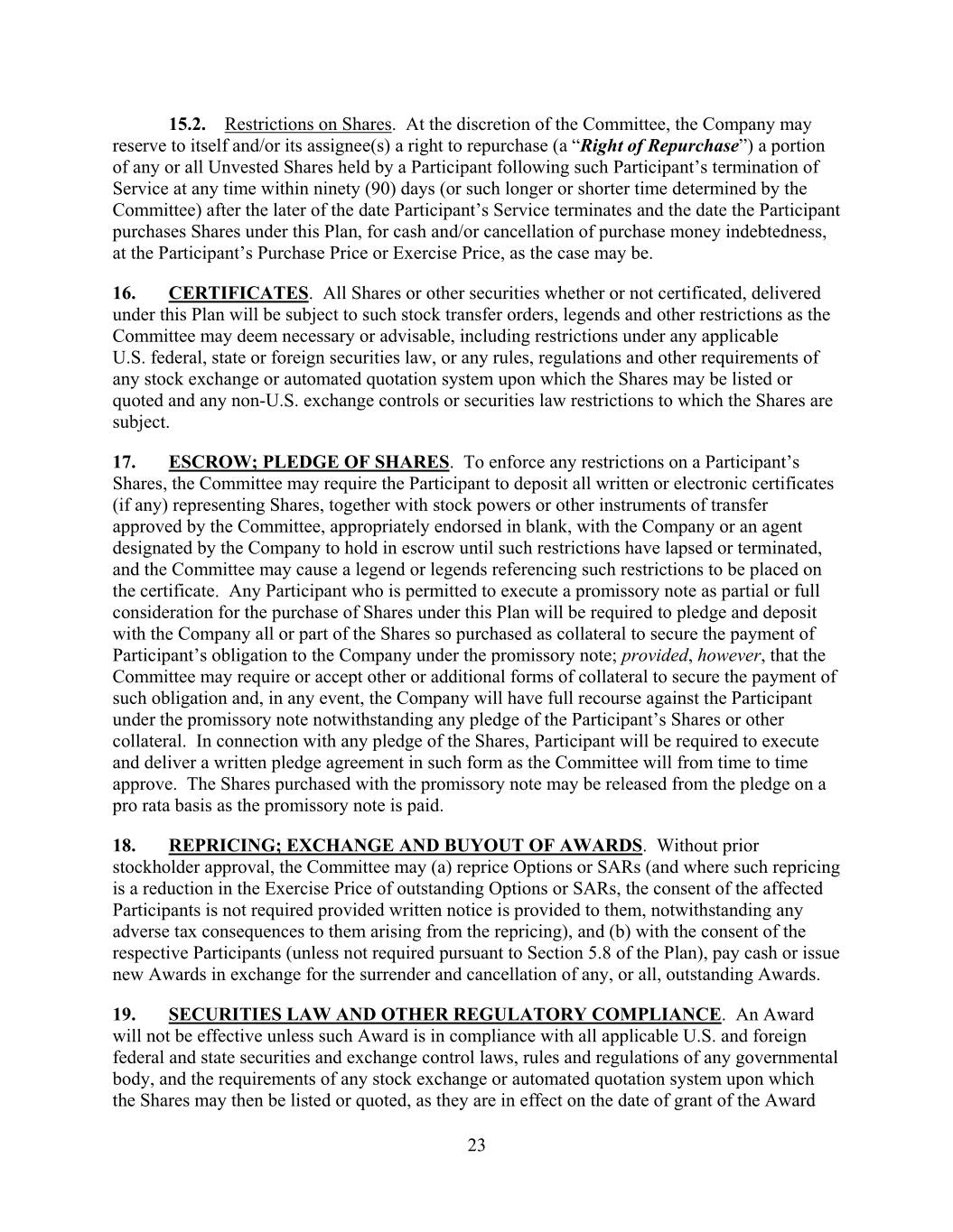 15.2. Restrictions on Shares. At the discretion of the Committee, the Company may reserve to itself and/or its assignee(s) a right to repurchase (a “Right of Repurchase”) a portion of any or all Unvested Shares held by a Participant following such Participant’s termination of Service at any time within ninety (90) days (or such longer or shorter time determined by the Committee) after the later of the date Participant’s Service terminates and the date the Participant purchases Shares under this Plan, for cash and/or cancellation of purchase money indebtedness, at the Participant’s Purchase Price or Exercise Price, as the case may be. 16. CERTIFICATES. All Shares or other securities whether or not certificated, delivered under this Plan will be subject to such stock transfer orders, legends and other restrictions as the Committee may deem necessary or advisable, including restrictions under any applicable U.S. federal, state or foreign securities law, or any rules, regulations and other requirements of any stock exchange or automated quotation system upon which the Shares may be listed or quoted and any non-U.S. exchange controls or securities law restrictions to which the Shares are subject. 17. ESCROW; PLEDGE OF SHARES. To enforce any restrictions on a Participant’s Shares, the Committee may require the Participant to deposit all written or electronic certificates (if any) representing Shares, together with stock powers or other instruments of transfer approved by the Committee, appropriately endorsed in blank, with the Company or an agent designated by the Company to hold in escrow until such restrictions have lapsed or terminated, and the Committee may cause a legend or legends referencing such restrictions to be placed on the certificate. Any Participant who is permitted to execute a promissory note as partial or full consideration for the purchase of Shares under this Plan will be required to pledge and deposit with the Company all or part of the Shares so purchased as collateral to secure the payment of Participant’s obligation to the Company under the promissory note; provided, however, that the Committee may require or accept other or additional forms of collateral to secure the payment of such obligation and, in any event, the Company will have full recourse against the Participant under the promissory note notwithstanding any pledge of the Participant’s Shares or other collateral. In connection with any pledge of the Shares, Participant will be required to execute and deliver a written pledge agreement in such form as the Committee will from time to time approve. The Shares purchased with the promissory note may be released from the pledge on a pro rata basis as the promissory note is paid. 18. REPRICING; EXCHANGE AND BUYOUT OF AWARDS. Without prior stockholder approval, the Committee may (a) reprice Options or SARs (and where such repricing is a reduction in the Exercise Price of outstanding Options or SARs, the consent of the affected Participants is not required provided written notice is provided to them, notwithstanding any adverse tax consequences to them arising from the repricing), and (b) with the consent of the respective Participants (unless not required pursuant to Section 5.8 of the Plan), pay cash or issue new Awards in exchange for the surrender and cancellation of any, or all, outstanding Awards. 19. SECURITIES LAW AND OTHER REGULATORY COMPLIANCE. An Award will not be effective unless such Award is in compliance with all applicable U.S. and foreign federal and state securities and exchange control laws, rules and regulations of any governmental body, and the requirements of any stock exchange or automated quotation system upon which the Shares may then be listed or quoted, as they are in effect on the date of grant of the Award 23