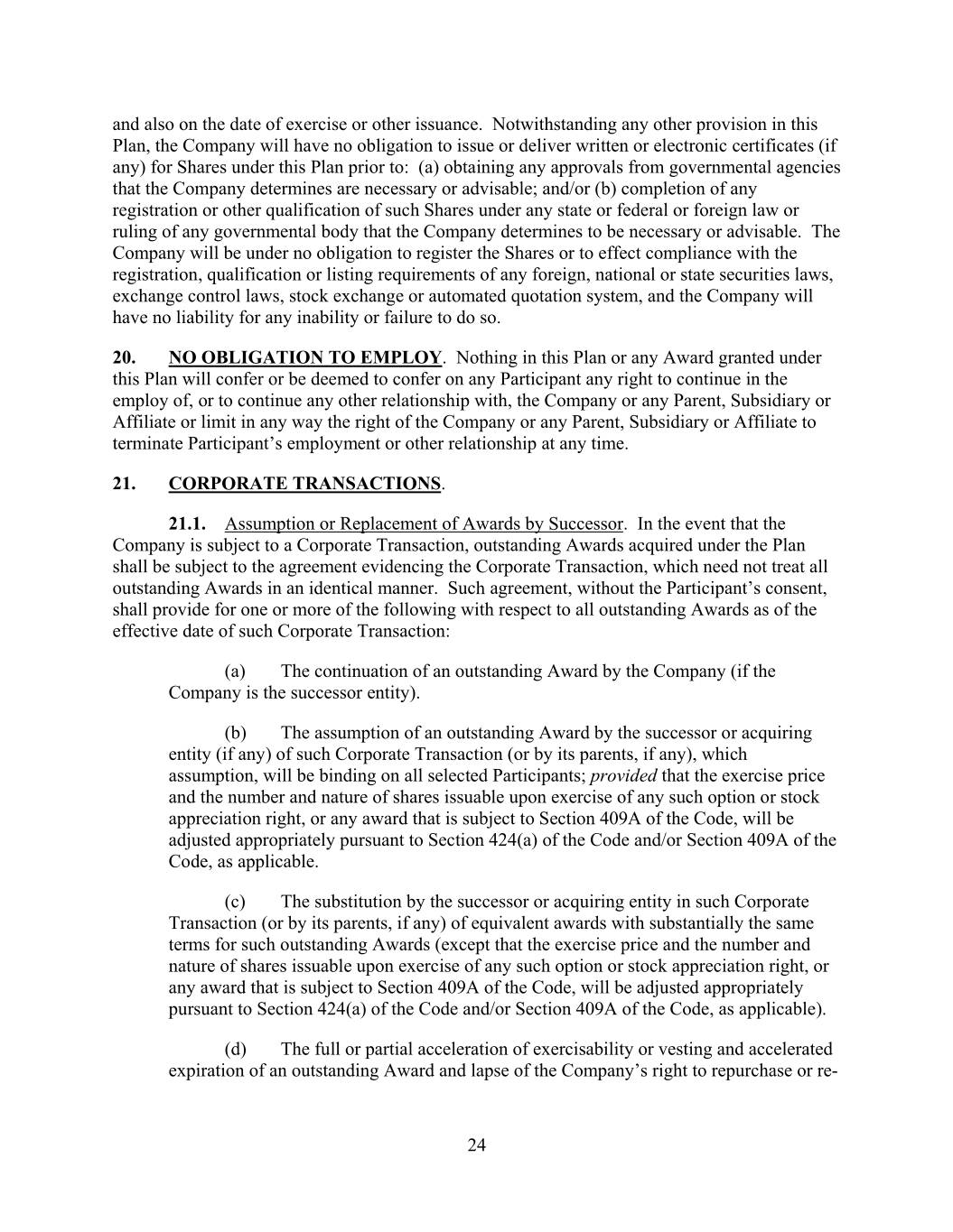 and also on the date of exercise or other issuance. Notwithstanding any other provision in this Plan, the Company will have no obligation to issue or deliver written or electronic certificates (if any) for Shares under this Plan prior to: (a) obtaining any approvals from governmental agencies that the Company determines are necessary or advisable; and/or (b) completion of any registration or other qualification of such Shares under any state or federal or foreign law or ruling of any governmental body that the Company determines to be necessary or advisable. The Company will be under no obligation to register the Shares or to effect compliance with the registration, qualification or listing requirements of any foreign, national or state securities laws, exchange control laws, stock exchange or automated quotation system, and the Company will have no liability for any inability or failure to do so. 20. NO OBLIGATION TO EMPLOY. Nothing in this Plan or any Award granted under this Plan will confer or be deemed to confer on any Participant any right to continue in the employ of, or to continue any other relationship with, the Company or any Parent, Subsidiary or Affiliate or limit in any way the right of the Company or any Parent, Subsidiary or Affiliate to terminate Participant’s employment or other relationship at any time. 21. CORPORATE TRANSACTIONS. 21.1. Assumption or Replacement of Awards by Successor. In the event that the Company is subject to a Corporate Transaction, outstanding Awards acquired under the Plan shall be subject to the agreement evidencing the Corporate Transaction, which need not treat all outstanding Awards in an identical manner. Such agreement, without the Participant’s consent, shall provide for one or more of the following with respect to all outstanding Awards as of the effective date of such Corporate Transaction: (a) The continuation of an outstanding Award by the Company (if the Company is the successor entity). (b) The assumption of an outstanding Award by the successor or acquiring entity (if any) of such Corporate Transaction (or by its parents, if any), which assumption, will be binding on all selected Participants; provided that the exercise price and the number and nature of shares issuable upon exercise of any such option or stock appreciation right, or any award that is subject to Section 409A of the Code, will be adjusted appropriately pursuant to Section 424(a) of the Code and/or Section 409A of the Code, as applicable. (c) The substitution by the successor or acquiring entity in such Corporate Transaction (or by its parents, if any) of equivalent awards with substantially the same terms for such outstanding Awards (except that the exercise price and the number and nature of shares issuable upon exercise of any such option or stock appreciation right, or any award that is subject to Section 409A of the Code, will be adjusted appropriately pursuant to Section 424(a) of the Code and/or Section 409A of the Code, as applicable). (d) The full or partial acceleration of exercisability or vesting and accelerated expiration of an outstanding Award and lapse of the Company’s right to repurchase or re- 24