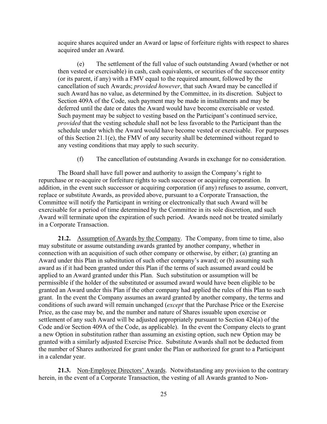 acquire shares acquired under an Award or lapse of forfeiture rights with respect to shares acquired under an Award. (e) The settlement of the full value of such outstanding Award (whether or not then vested or exercisable) in cash, cash equivalents, or securities of the successor entity (or its parent, if any) with a FMV equal to the required amount, followed by the cancellation of such Awards; provided however, that such Award may be cancelled if such Award has no value, as determined by the Committee, in its discretion. Subject to Section 409A of the Code, such payment may be made in installments and may be deferred until the date or dates the Award would have become exercisable or vested. Such payment may be subject to vesting based on the Participant’s continued service, provided that the vesting schedule shall not be less favorable to the Participant than the schedule under which the Award would have become vested or exercisable. For purposes of this Section 21.1(e), the FMV of any security shall be determined without regard to any vesting conditions that may apply to such security. (f) The cancellation of outstanding Awards in exchange for no consideration. The Board shall have full power and authority to assign the Company’s right to repurchase or re-acquire or forfeiture rights to such successor or acquiring corporation. In addition, in the event such successor or acquiring corporation (if any) refuses to assume, convert, replace or substitute Awards, as provided above, pursuant to a Corporate Transaction, the Committee will notify the Participant in writing or electronically that such Award will be exercisable for a period of time determined by the Committee in its sole discretion, and such Award will terminate upon the expiration of such period. Awards need not be treated similarly in a Corporate Transaction. 21.2. Assumption of Awards by the Company. The Company, from time to time, also may substitute or assume outstanding awards granted by another company, whether in connection with an acquisition of such other company or otherwise, by either; (a) granting an Award under this Plan in substitution of such other company’s award; or (b) assuming such award as if it had been granted under this Plan if the terms of such assumed award could be applied to an Award granted under this Plan. Such substitution or assumption will be permissible if the holder of the substituted or assumed award would have been eligible to be granted an Award under this Plan if the other company had applied the rules of this Plan to such grant. In the event the Company assumes an award granted by another company, the terms and conditions of such award will remain unchanged (except that the Purchase Price or the Exercise Price, as the case may be, and the number and nature of Shares issuable upon exercise or settlement of any such Award will be adjusted appropriately pursuant to Section 424(a) of the Code and/or Section 409A of the Code, as applicable). In the event the Company elects to grant a new Option in substitution rather than assuming an existing option, such new Option may be granted with a similarly adjusted Exercise Price. Substitute Awards shall not be deducted from the number of Shares authorized for grant under the Plan or authorized for grant to a Participant in a calendar year. 21.3. Non-Employee Directors’ Awards. Notwithstanding any provision to the contrary herein, in the event of a Corporate Transaction, the vesting of all Awards granted to Non- 25