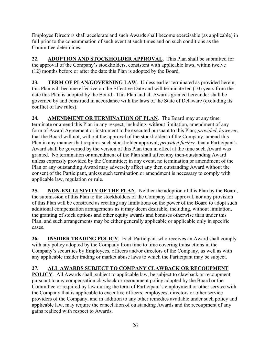 Employee Directors shall accelerate and such Awards shall become exercisable (as applicable) in full prior to the consummation of such event at such times and on such conditions as the Committee determines. 22. ADOPTION AND STOCKHOLDER APPROVAL. This Plan shall be submitted for the approval of the Company’s stockholders, consistent with applicable laws, within twelve (12) months before or after the date this Plan is adopted by the Board. 23. TERM OF PLAN/GOVERNING LAW. Unless earlier terminated as provided herein, this Plan will become effective on the Effective Date and will terminate ten (10) years from the date this Plan is adopted by the Board. This Plan and all Awards granted hereunder shall be governed by and construed in accordance with the laws of the State of Delaware (excluding its conflict of law rules). 24. AMENDMENT OR TERMINATION OF PLAN. The Board may at any time terminate or amend this Plan in any respect, including, without limitation, amendment of any form of Award Agreement or instrument to be executed pursuant to this Plan; provided, however, that the Board will not, without the approval of the stockholders of the Company, amend this Plan in any manner that requires such stockholder approval; provided further, that a Participant’s Award shall be governed by the version of this Plan then in effect at the time such Award was granted. No termination or amendment of the Plan shall affect any then-outstanding Award unless expressly provided by the Committee; in any event, no termination or amendment of the Plan or any outstanding Award may adversely affect any then outstanding Award without the consent of the Participant, unless such termination or amendment is necessary to comply with applicable law, regulation or rule. 25. NON-EXCLUSIVITY OF THE PLAN. Neither the adoption of this Plan by the Board, the submission of this Plan to the stockholders of the Company for approval, nor any provision of this Plan will be construed as creating any limitations on the power of the Board to adopt such additional compensation arrangements as it may deem desirable, including, without limitation, the granting of stock options and other equity awards and bonuses otherwise than under this Plan, and such arrangements may be either generally applicable or applicable only in specific cases. 26. INSIDER TRADING POLICY. Each Participant who receives an Award shall comply with any policy adopted by the Company from time to time covering transactions in the Company’s securities by Employees, officers and/or directors of the Company, as well as with any applicable insider trading or market abuse laws to which the Participant may be subject. 27. ALL AWARDS SUBJECT TO COMPANY CLAWBACK OR RECOUPMENT POLICY. All Awards shall, subject to applicable law, be subject to clawback or recoupment pursuant to any compensation clawback or recoupment policy adopted by the Board or the Committee or required by law during the term of Participant’s employment or other service with the Company that is applicable to executive officers, employees, directors or other service providers of the Company, and in addition to any other remedies available under such policy and applicable law, may require the cancelation of outstanding Awards and the recoupment of any gains realized with respect to Awards. 26