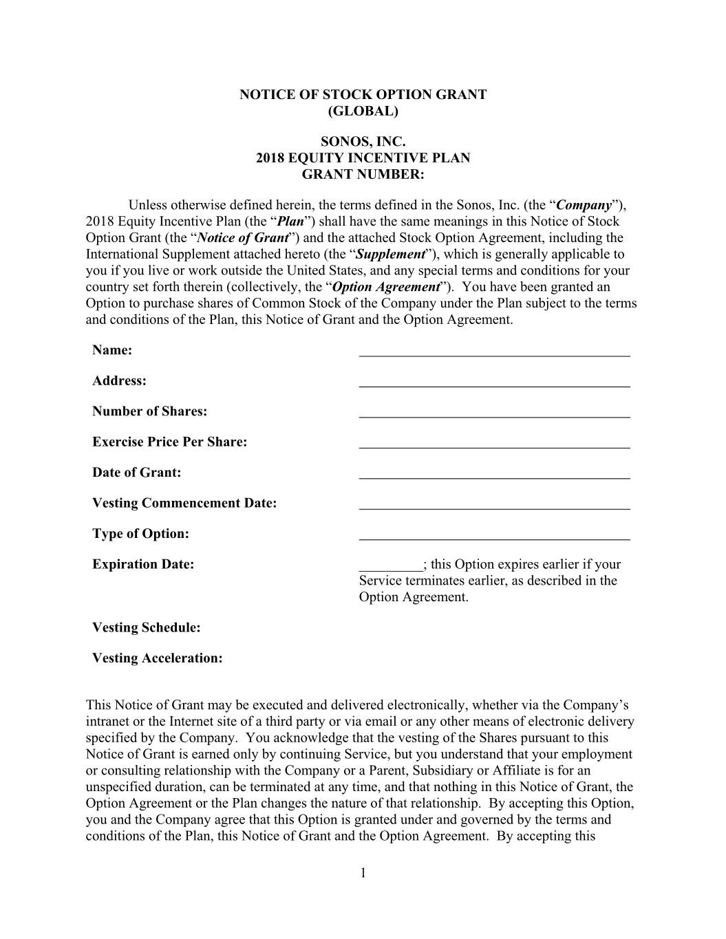 NOTICE OF STOCK OPTION GRANT (GLOBAL) SONOS, INC. 2018 EQUITY INCENTIVE PLAN GRANT NUMBER: Unless otherwise defined herein, the terms defined in the Sonos, Inc. (the “Company”), 2018 Equity Incentive Plan (the “Plan”) shall have the same meanings in this Notice of Stock Option Grant (the “Notice of Grant”) and the attached Stock Option Agreement, including the International Supplement attached hereto (the “Supplement”), which is generally applicable to you if you live or work outside the United States, and any special terms and conditions for your country set forth therein (collectively, the “Option Agreement”). You have been granted an Option to purchase shares of Common Stock of the Company under the Plan subject to the terms and conditions of the Plan, this Notice of Grant and the Option Agreement. Name: Address: Number of Shares: Exercise Price Per Share: Date of Grant: Vesting Commencement Date: Type of Option: Expiration Date: _________; this Option expires earlier if your Service terminates earlier, as described in the Option Agreement. Vesting Schedule: Vesting Acceleration: This Notice of Grant may be executed and delivered electronically, whether via the Company’s intranet or the Internet site of a third party or via email or any other means of electronic delivery specified by the Company. You acknowledge that the vesting of the Shares pursuant to this Notice of Grant is earned only by continuing Service, but you understand that your employment or consulting relationship with the Company or a Parent, Subsidiary or Affiliate is for an unspecified duration, can be terminated at any time, and that nothing in this Notice of Grant, the Option Agreement or the Plan changes the nature of that relationship. By accepting this Option, you and the Company agree that this Option is granted under and governed by the terms and conditions of the Plan, this Notice of Grant and the Option Agreement. By accepting this 1