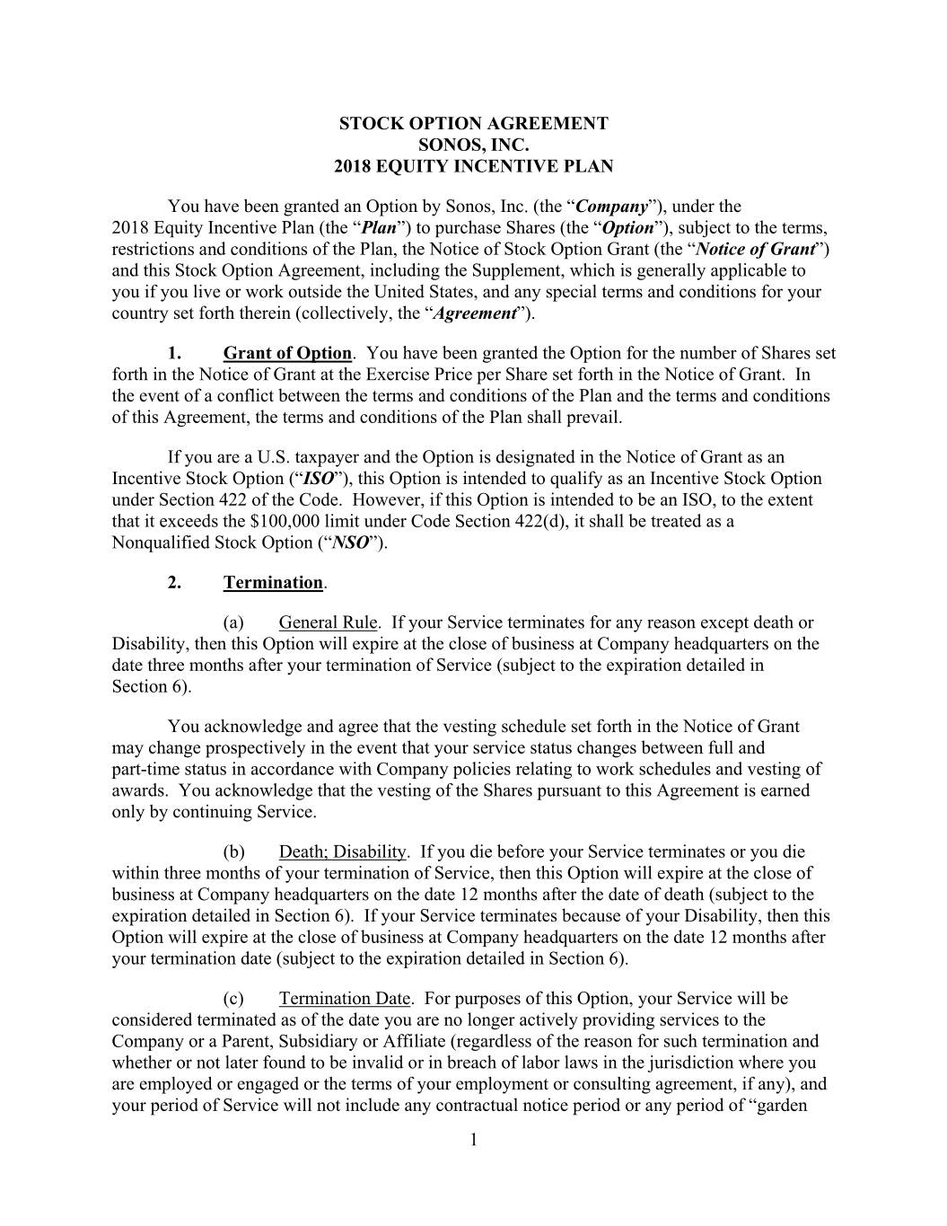 STOCK OPTION AGREEMENT SONOS, INC. 2018 EQUITY INCENTIVE PLAN You have been granted an Option by Sonos, Inc. (the “Company”), under the 2018 Equity Incentive Plan (the “Plan”) to purchase Shares (the “Option”), subject to the terms, restrictions and conditions of the Plan, the Notice of Stock Option Grant (the “Notice of Grant”) and this Stock Option Agreement, including the Supplement, which is generally applicable to you if you live or work outside the United States, and any special terms and conditions for your country set forth therein (collectively, the “Agreement”). 1. Grant of Option. You have been granted the Option for the number of Shares set forth in the Notice of Grant at the Exercise Price per Share set forth in the Notice of Grant. In the event of a conflict between the terms and conditions of the Plan and the terms and conditions of this Agreement, the terms and conditions of the Plan shall prevail. If you are a U.S. taxpayer and the Option is designated in the Notice of Grant as an Incentive Stock Option (“ISO”), this Option is intended to qualify as an Incentive Stock Option under Section 422 of the Code. However, if this Option is intended to be an ISO, to the extent that it exceeds the $100,000 limit under Code Section 422(d), it shall be treated as a Nonqualified Stock Option (“NSO”). 2. Termination. (a) General Rule. If your Service terminates for any reason except death or Disability, then this Option will expire at the close of business at Company headquarters on the date three months after your termination of Service (subject to the expiration detailed in Section 6). You acknowledge and agree that the vesting schedule set forth in the Notice of Grant may change prospectively in the event that your service status changes between full and part-time status in accordance with Company policies relating to work schedules and vesting of awards. You acknowledge that the vesting of the Shares pursuant to this Agreement is earned only by continuing Service. (b) Death; Disability. If you die before your Service terminates or you die within three months of your termination of Service, then this Option will expire at the close of business at Company headquarters on the date 12 months after the date of death (subject to the expiration detailed in Section 6). If your Service terminates because of your Disability, then this Option will expire at the close of business at Company headquarters on the date 12 months after your termination date (subject to the expiration detailed in Section 6). (c) Termination Date. For purposes of this Option, your Service will be considered terminated as of the date you are no longer actively providing services to the Company or a Parent, Subsidiary or Affiliate (regardless of the reason for such termination and whether or not later found to be invalid or in breach of labor laws in the jurisdiction where you are employed or engaged or the terms of your employment or consulting agreement, if any), and your period of Service will not include any contractual notice period or any period of “garden 1