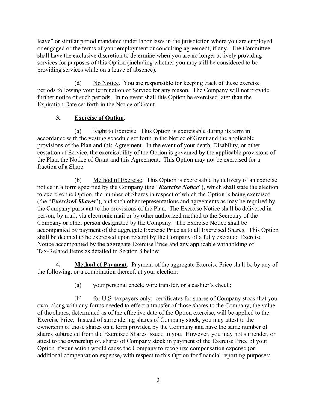 leave” or similar period mandated under labor laws in the jurisdiction where you are employed or engaged or the terms of your employment or consulting agreement, if any. The Committee shall have the exclusive discretion to determine when you are no longer actively providing services for purposes of this Option (including whether you may still be considered to be providing services while on a leave of absence). (d) No Notice. You are responsible for keeping track of these exercise periods following your termination of Service for any reason. The Company will not provide further notice of such periods. In no event shall this Option be exercised later than the Expiration Date set forth in the Notice of Grant. 3. Exercise of Option. (a) Right to Exercise. This Option is exercisable during its term in accordance with the vesting schedule set forth in the Notice of Grant and the applicable provisions of the Plan and this Agreement. In the event of your death, Disability, or other cessation of Service, the exercisability of the Option is governed by the applicable provisions of the Plan, the Notice of Grant and this Agreement. This Option may not be exercised for a fraction of a Share. (b) Method of Exercise. This Option is exercisable by delivery of an exercise notice in a form specified by the Company (the “Exercise Notice”), which shall state the election to exercise the Option, the number of Shares in respect of which the Option is being exercised (the “Exercised Shares”), and such other representations and agreements as may be required by the Company pursuant to the provisions of the Plan. The Exercise Notice shall be delivered in person, by mail, via electronic mail or by other authorized method to the Secretary of the Company or other person designated by the Company. The Exercise Notice shall be accompanied by payment of the aggregate Exercise Price as to all Exercised Shares. This Option shall be deemed to be exercised upon receipt by the Company of a fully executed Exercise Notice accompanied by the aggregate Exercise Price and any applicable withholding of Tax-Related Items as detailed in Section 8 below. 4. Method of Payment. Payment of the aggregate Exercise Price shall be by any of the following, or a combination thereof, at your election: (a) your personal check, wire transfer, or a cashier’s check; (b) for U.S. taxpayers only: certificates for shares of Company stock that you own, along with any forms needed to effect a transfer of those shares to the Company; the value of the shares, determined as of the effective date of the Option exercise, will be applied to the Exercise Price. Instead of surrendering shares of Company stock, you may attest to the ownership of those shares on a form provided by the Company and have the same number of shares subtracted from the Exercised Shares issued to you. However, you may not surrender, or attest to the ownership of, shares of Company stock in payment of the Exercise Price of your Option if your action would cause the Company to recognize compensation expense (or additional compensation expense) with respect to this Option for financial reporting purposes; 2