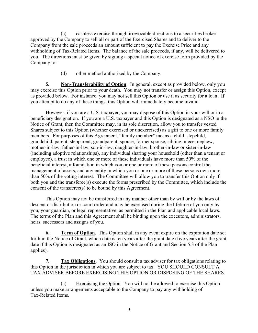 (c) cashless exercise through irrevocable directions to a securities broker approved by the Company to sell all or part of the Exercised Shares and to deliver to the Company from the sale proceeds an amount sufficient to pay the Exercise Price and any withholding of Tax-Related Items. The balance of the sale proceeds, if any, will be delivered to you. The directions must be given by signing a special notice of exercise form provided by the Company; or (d) other method authorized by the Company. 5. Non-Transferability of Option. In general, except as provided below, only you may exercise this Option prior to your death. You may not transfer or assign this Option, except as provided below. For instance, you may not sell this Option or use it as security for a loan. If you attempt to do any of these things, this Option will immediately become invalid. However, if you are a U.S. taxpayer, you may dispose of this Option in your will or in a beneficiary designation. If you are a U.S. taxpayer and this Option is designated as a NSO in the Notice of Grant, then the Committee may, in its sole discretion, allow you to transfer vested Shares subject to this Option (whether exercised or unexercised) as a gift to one or more family members. For purposes of this Agreement, “family member” means a child, stepchild, grandchild, parent, stepparent, grandparent, spouse, former spouse, sibling, niece, nephew, mother-in-law, father-in-law, son-in-law, daughter-in-law, brother-in-law or sister-in-law (including adoptive relationships), any individual sharing your household (other than a tenant or employee), a trust in which one or more of these individuals have more than 50% of the beneficial interest, a foundation in which you or one or more of these persons control the management of assets, and any entity in which you or one or more of these persons own more than 50% of the voting interest. The Committee will allow you to transfer this Option only if both you and the transferee(s) execute the forms prescribed by the Committee, which include the consent of the transferee(s) to be bound by this Agreement. This Option may not be transferred in any manner other than by will or by the laws of descent or distribution or court order and may be exercised during the lifetime of you only by you, your guardian, or legal representative, as permitted in the Plan and applicable local laws. The terms of the Plan and this Agreement shall be binding upon the executors, administrators, heirs, successors and assigns of you. 6. Term of Option. This Option shall in any event expire on the expiration date set forth in the Notice of Grant, which date is ten years after the grant date (five years after the grant date if this Option is designated as an ISO in the Notice of Grant and Section 5.3 of the Plan applies). 7. Tax Obligations. You should consult a tax adviser for tax obligations relating to this Option in the jurisdiction in which you are subject to tax. YOU SHOULD CONSULT A TAX ADVISER BEFORE EXERCISING THIS OPTION OR DISPOSING OF THE SHARES. (a) Exercising the Option. You will not be allowed to exercise this Option unless you make arrangements acceptable to the Company to pay any withholding of Tax-Related Items. 3