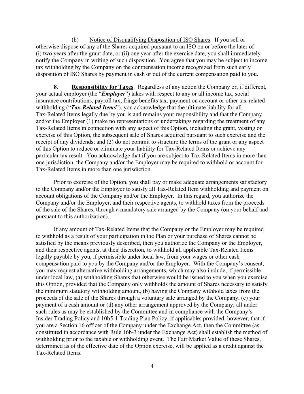 (b) Notice of Disqualifying Disposition of ISO Shares. If you sell or otherwise dispose of any of the Shares acquired pursuant to an ISO on or before the later of (i) two years after the grant date, or (ii) one year after the exercise date, you shall immediately notify the Company in writing of such disposition. You agree that you may be subject to income tax withholding by the Company on the compensation income recognized from such early disposition of ISO Shares by payment in cash or out of the current compensation paid to you. 8. Responsibility for Taxes. Regardless of any action the Company or, if different, your actual employer (the “Employer”) takes with respect to any or all income tax, social insurance contributions, payroll tax, fringe benefits tax, payment on account or other tax-related withholding (“Tax-Related Items”), you acknowledge that the ultimate liability for all Tax-Related Items legally due by you is and remains your responsibility and that the Company and/or the Employer (1) make no representations or undertakings regarding the treatment of any Tax-Related Items in connection with any aspect of this Option, including the grant, vesting or exercise of this Option, the subsequent sale of Shares acquired pursuant to such exercise and the receipt of any dividends; and (2) do not commit to structure the terms of the grant or any aspect of this Option to reduce or eliminate your liability for Tax-Related Items or achieve any particular tax result. You acknowledge that if you are subject to Tax-Related Items in more than one jurisdiction, the Company and/or the Employer may be required to withhold or account for Tax-Related Items in more than one jurisdiction. Prior to exercise of the Option, you shall pay or make adequate arrangements satisfactory to the Company and/or the Employer to satisfy all Tax-Related Item withholding and payment on account obligations of the Company and/or the Employer. In this regard, you authorize the Company and/or the Employer, and their respective agents, to withhold taxes from the proceeds of the sale of the Shares, through a mandatory sale arranged by the Company (on your behalf and pursuant to this authorization). If any amount of Tax-Related Items that the Company or the Employer may be required to withhold as a result of your participation in the Plan or your purchase of Shares cannot be satisfied by the means previously described, then you authorize the Company or the Employer, and their respective agents, at their discretion, to withhold all applicable Tax-Related Items legally payable by you, if permissible under local law, from your wages or other cash compensation paid to you by the Company and/or the Employer. With the Company’s consent, you may request alternative withholding arrangements, which may also include, if permissible under local law, (a) withholding Shares that otherwise would be issued to you when you exercise this Option, provided that the Company only withholds the amount of Shares necessary to satisfy the minimum statutory withholding amount, (b) having the Company withhold taxes from the proceeds of the sale of the Shares through a voluntary sale arranged by the Company, (c) your payment of a cash amount or (d) any other arrangement approved by the Company; all under such rules as may be established by the Committee and in compliance with the Company’s Insider Trading Policy and 10b5-1 Trading Plan Policy, if applicable; provided, however, that if you are a Section 16 officer of the Company under the Exchange Act, then the Committee (as constituted in accordance with Rule 16b-3 under the Exchange Act) shall establish the method of withholding prior to the taxable or withholding event. The Fair Market Value of these Shares, determined as of the effective date of the Option exercise, will be applied as a credit against the Tax-Related Items. 4