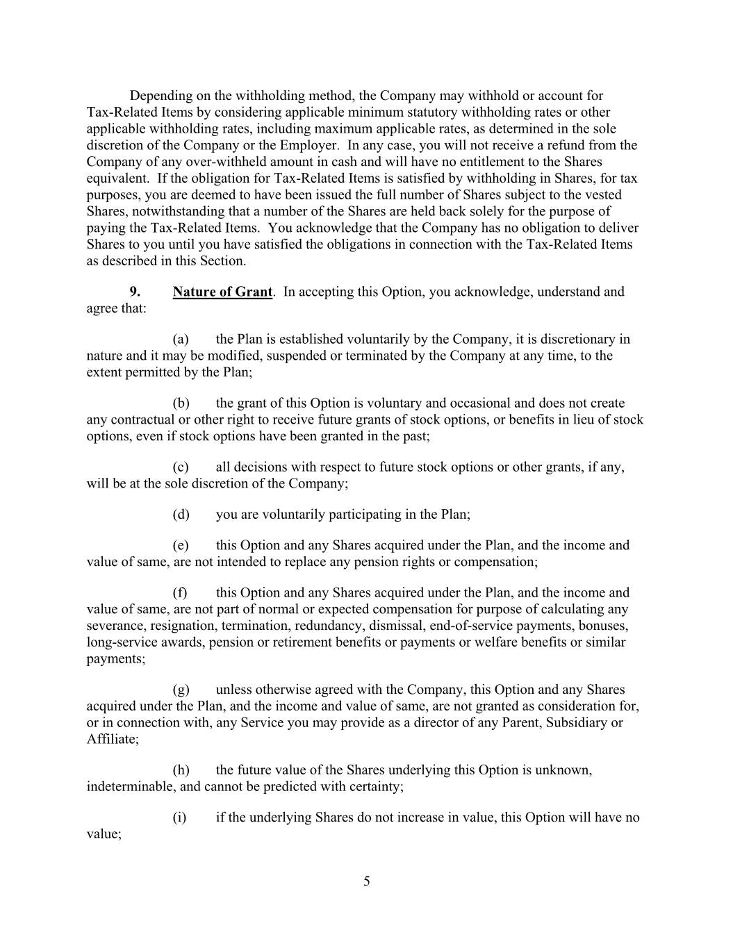 Depending on the withholding method, the Company may withhold or account for Tax-Related Items by considering applicable minimum statutory withholding rates or other applicable withholding rates, including maximum applicable rates, as determined in the sole discretion of the Company or the Employer. In any case, you will not receive a refund from the Company of any over-withheld amount in cash and will have no entitlement to the Shares equivalent. If the obligation for Tax-Related Items is satisfied by withholding in Shares, for tax purposes, you are deemed to have been issued the full number of Shares subject to the vested Shares, notwithstanding that a number of the Shares are held back solely for the purpose of paying the Tax-Related Items. You acknowledge that the Company has no obligation to deliver Shares to you until you have satisfied the obligations in connection with the Tax-Related Items as described in this Section. 9. Nature of Grant. In accepting this Option, you acknowledge, understand and agree that: (a) the Plan is established voluntarily by the Company, it is discretionary in nature and it may be modified, suspended or terminated by the Company at any time, to the extent permitted by the Plan; (b) the grant of this Option is voluntary and occasional and does not create any contractual or other right to receive future grants of stock options, or benefits in lieu of stock options, even if stock options have been granted in the past; (c) all decisions with respect to future stock options or other grants, if any, will be at the sole discretion of the Company; (d) you are voluntarily participating in the Plan; (e) this Option and any Shares acquired under the Plan, and the income and value of same, are not intended to replace any pension rights or compensation; (f) this Option and any Shares acquired under the Plan, and the income and value of same, are not part of normal or expected compensation for purpose of calculating any severance, resignation, termination, redundancy, dismissal, end-of-service payments, bonuses, long-service awards, pension or retirement benefits or payments or welfare benefits or similar payments; (g) unless otherwise agreed with the Company, this Option and any Shares acquired under the Plan, and the income and value of same, are not granted as consideration for, or in connection with, any Service you may provide as a director of any Parent, Subsidiary or Affiliate; (h) the future value of the Shares underlying this Option is unknown, indeterminable, and cannot be predicted with certainty; (i) if the underlying Shares do not increase in value, this Option will have no value; 5